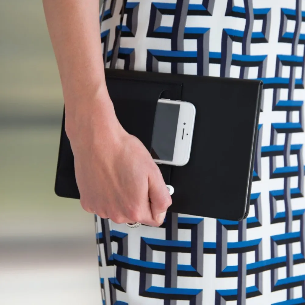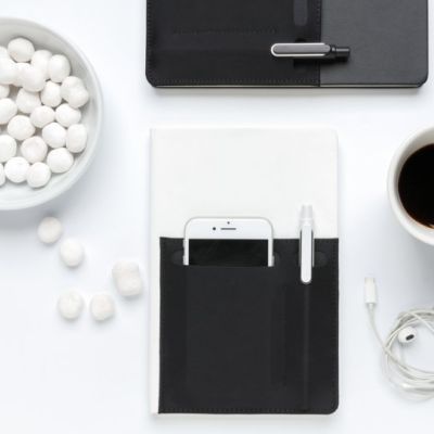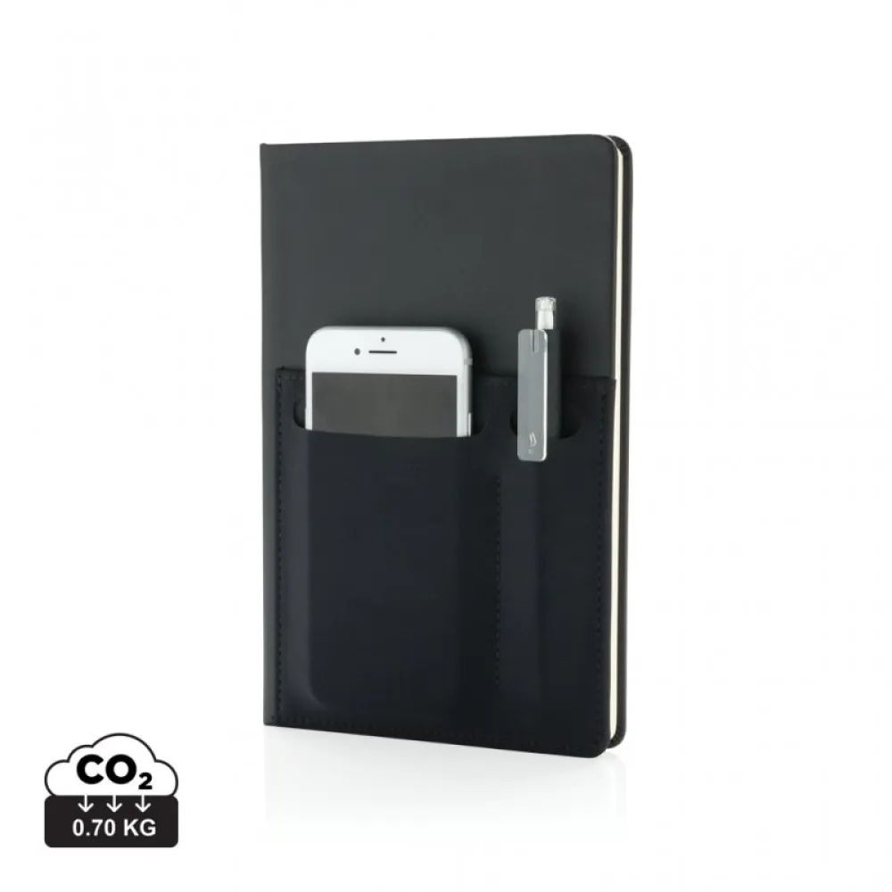 A5 notebook with 160 cream coloured lined pages of 80g/m2 paper inside. Front cover has a flexible phone pocket, pen pocket and larger sleeve pocket for documents.