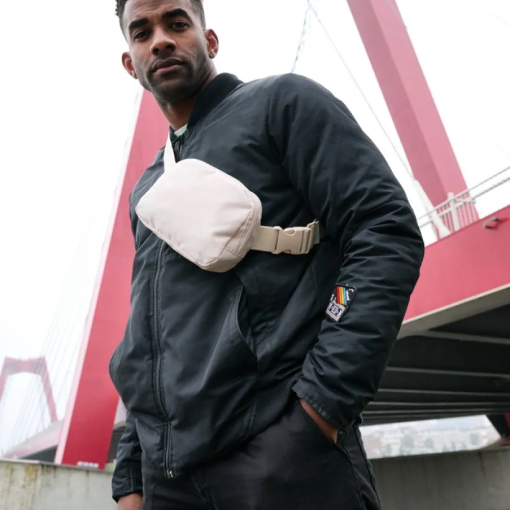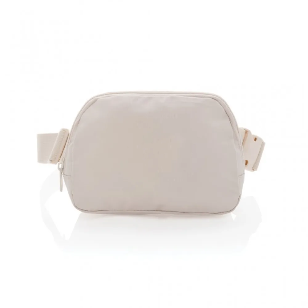 Made from 100% rPET, this sling bag features an adjustable belt/shoulder strap (100cm) with a 4cm webbing width for a comfortable fit. It offers a back zipper pocket and a main compartment with a zipper for secure storage.