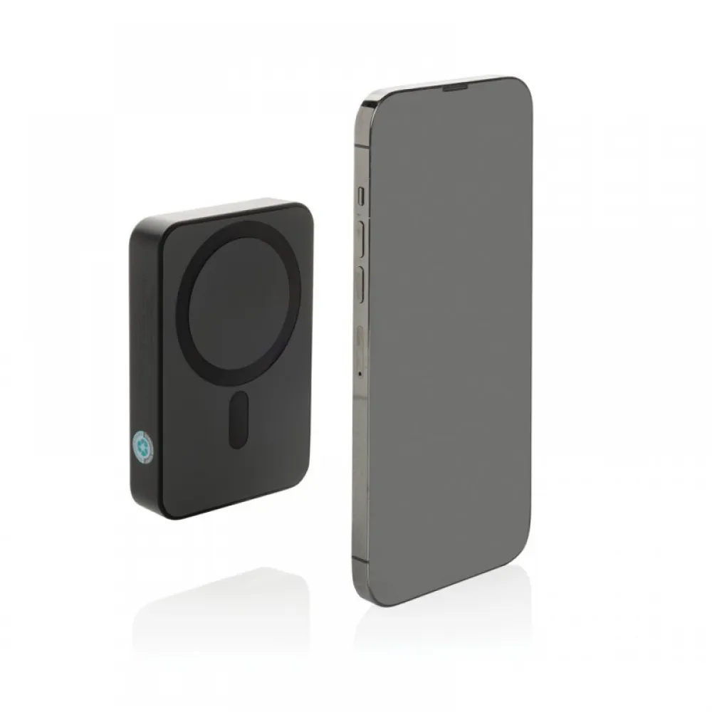 10.000 mAh pocket-size powerbank with 5W magnetic wireless charger with a case made out of RCS certified recycled ABS plastic. RCS (Recycled Claim Standard) is a standard to verify the recycled content of a product throughout the whole supply chain.