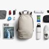 PET. Can be folded or rolled, and packed for travel. Internal document sleeve. Elevated essentials pocket with key clip.