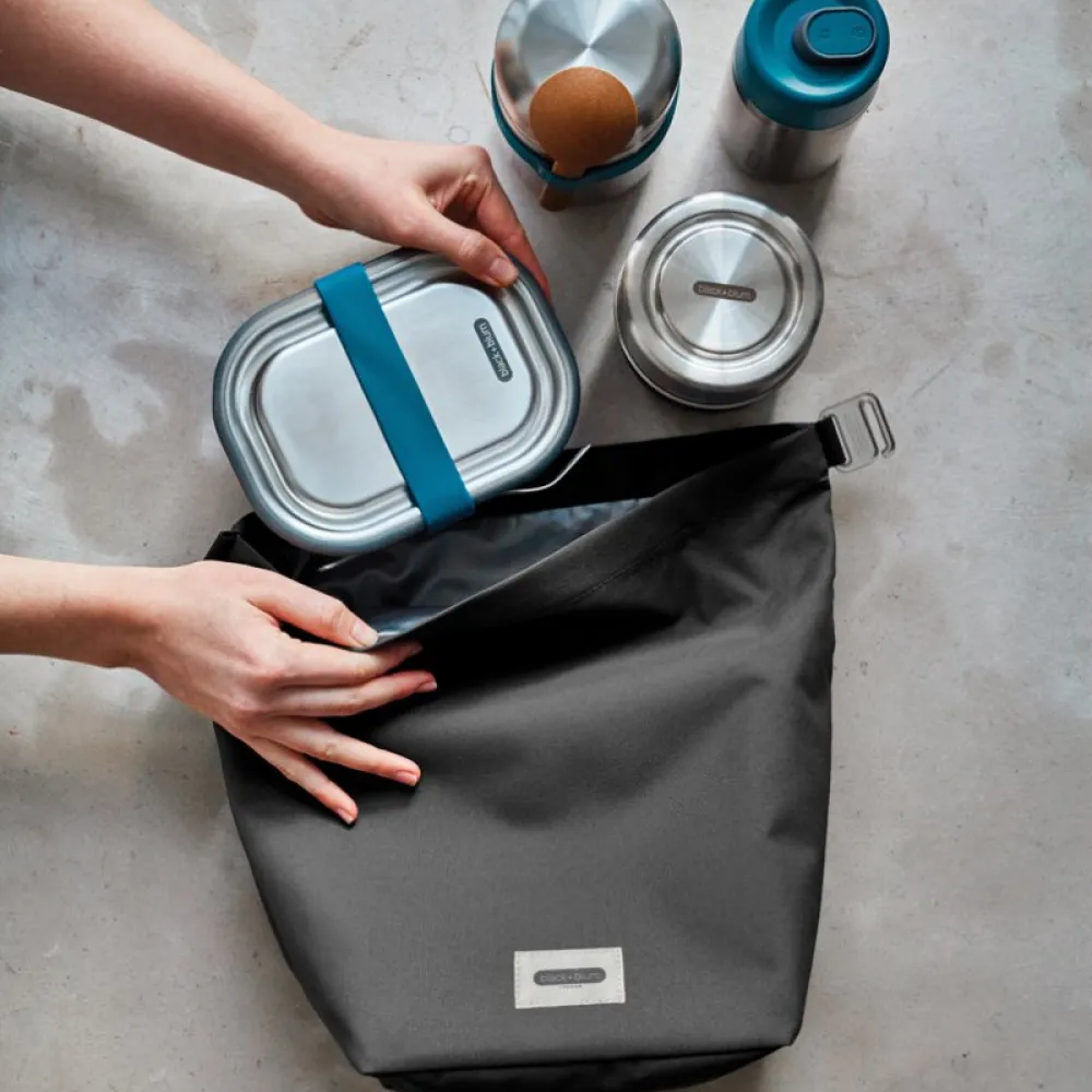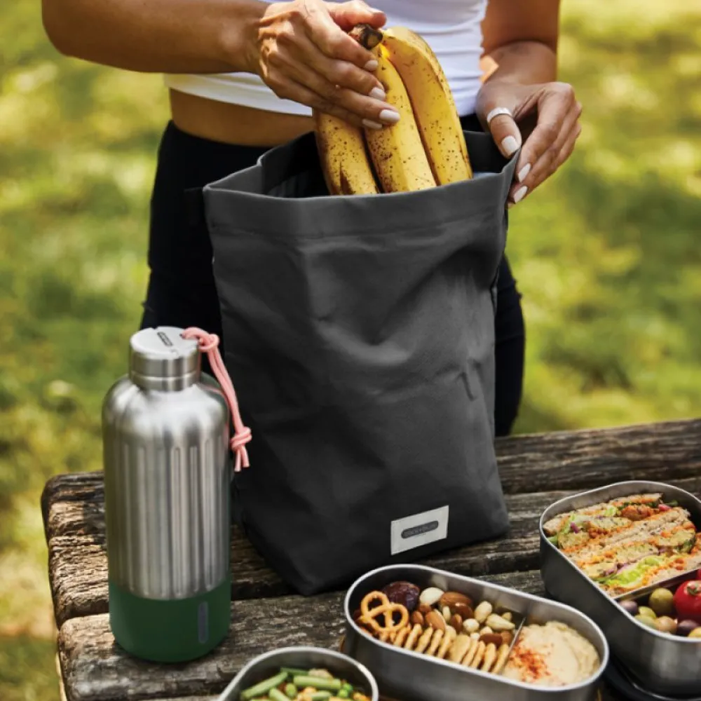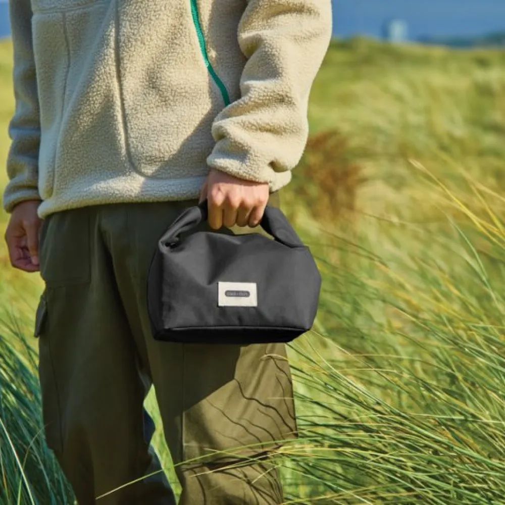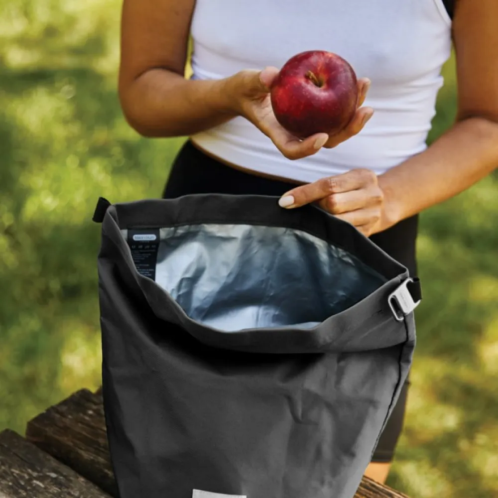 PET, such as used plastic bottles, and offers plenty of space for everything you need to get through the day—whether it’s a lunch box, water bottle, fruit, or snacks. It’s the ideal insulated lunch bag for both kids and adults, and it’s now available in four colours with matching tote bags. Inspired by the design of dry bags, the roll-top closure and welded lining make the bag 100% leak proof when stored upright.