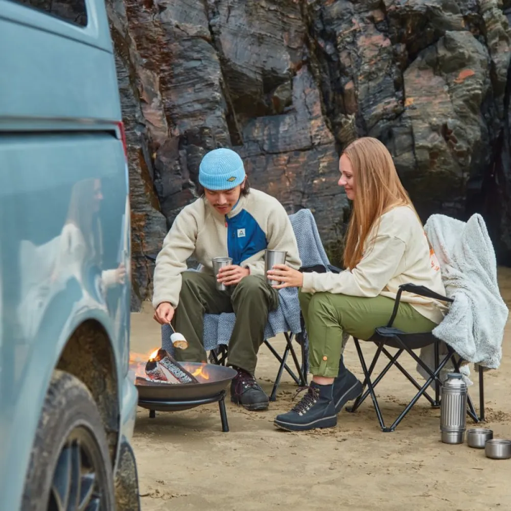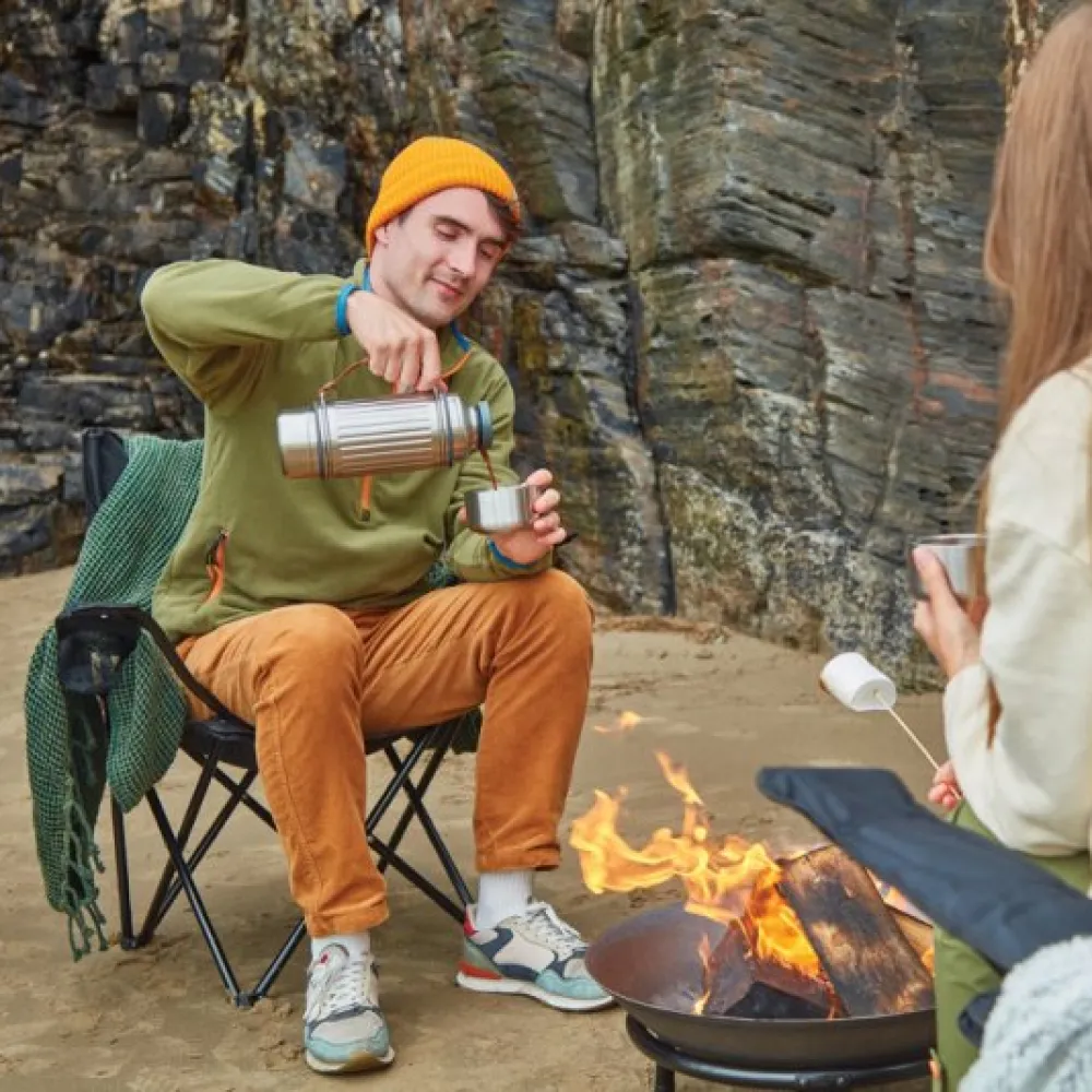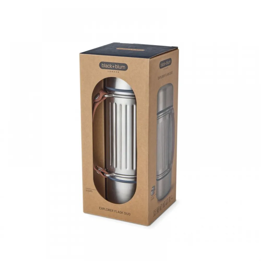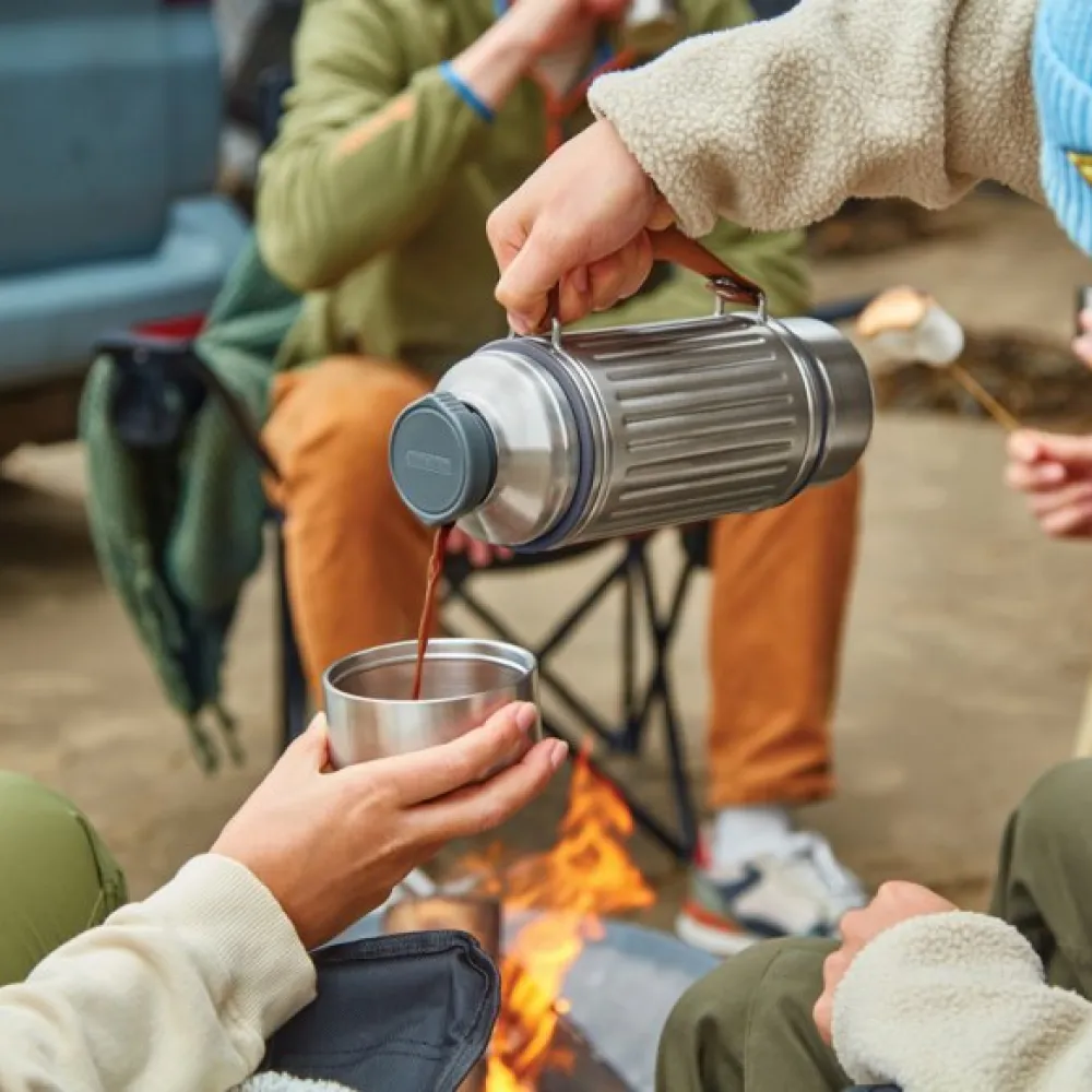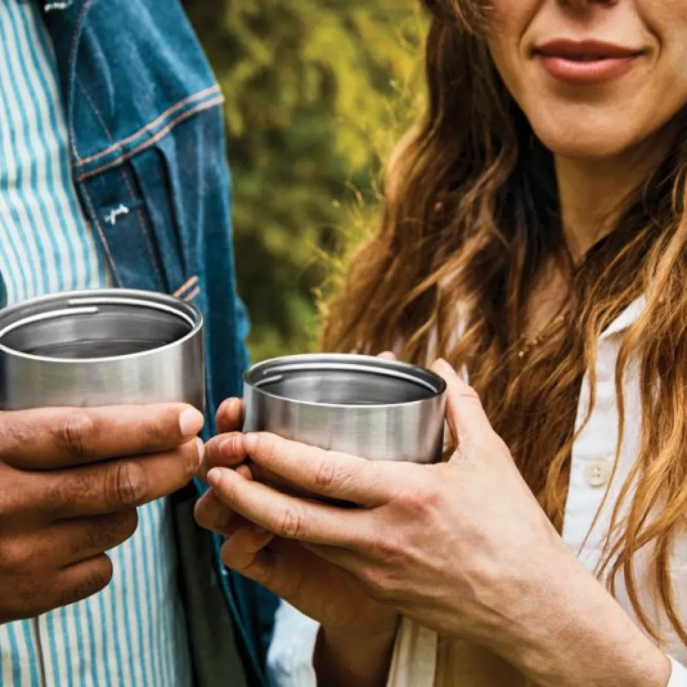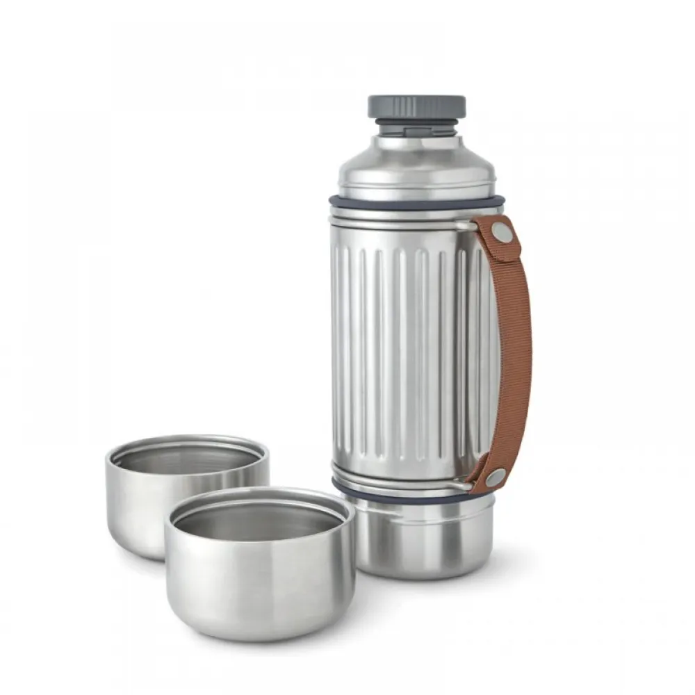 The wide-based cups offer extra stability on uneven ground, while a thick nylon strap makes it easy to carry or pour. A silicone gasket prevents drips when the cups are stored, and the flask is dishwasher-safe once the strap is removed.