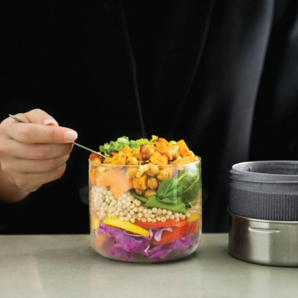 The silicone lid prevents splattering when microwaving and the base container is made from durable polypropylene combined with sustainably-sourced wood fibre which provides protection for the glass bowl and makes it easy to hold after microwaving.