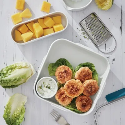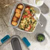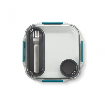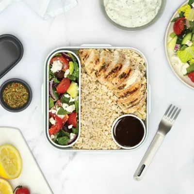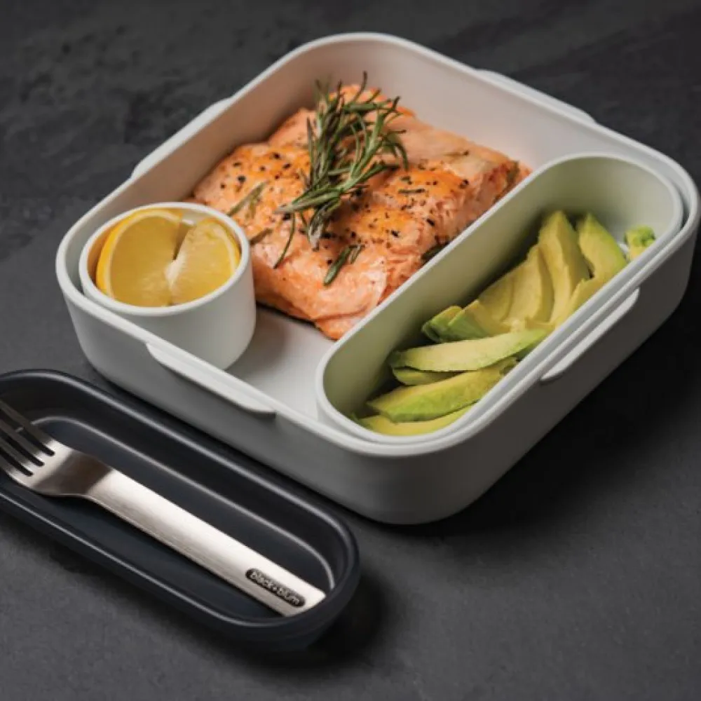 Box Original includes an inner container as well as a leak-proof sauce pot with a garnish area in the lid, and a stainless-steel fork.