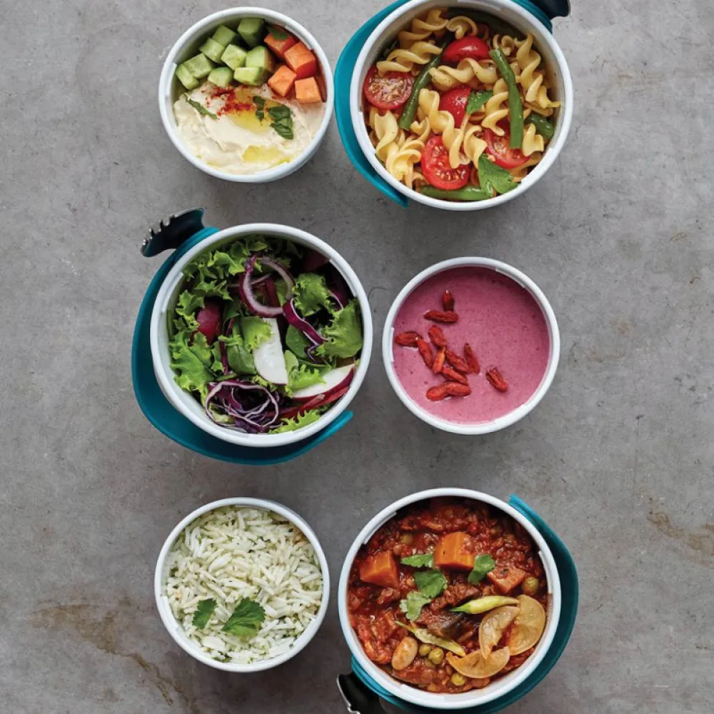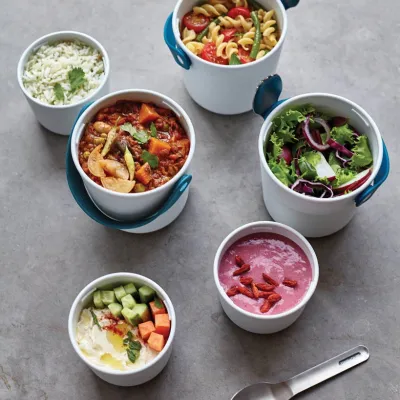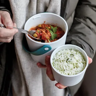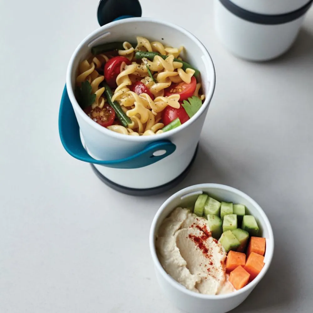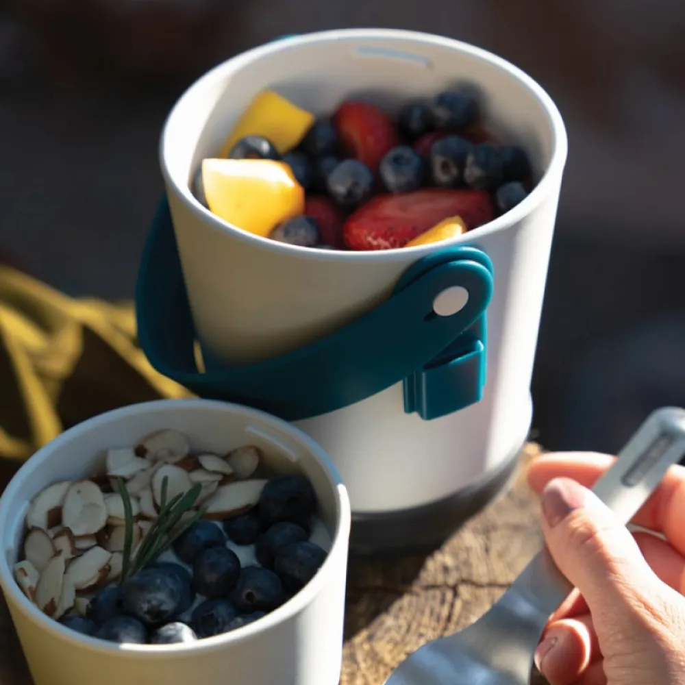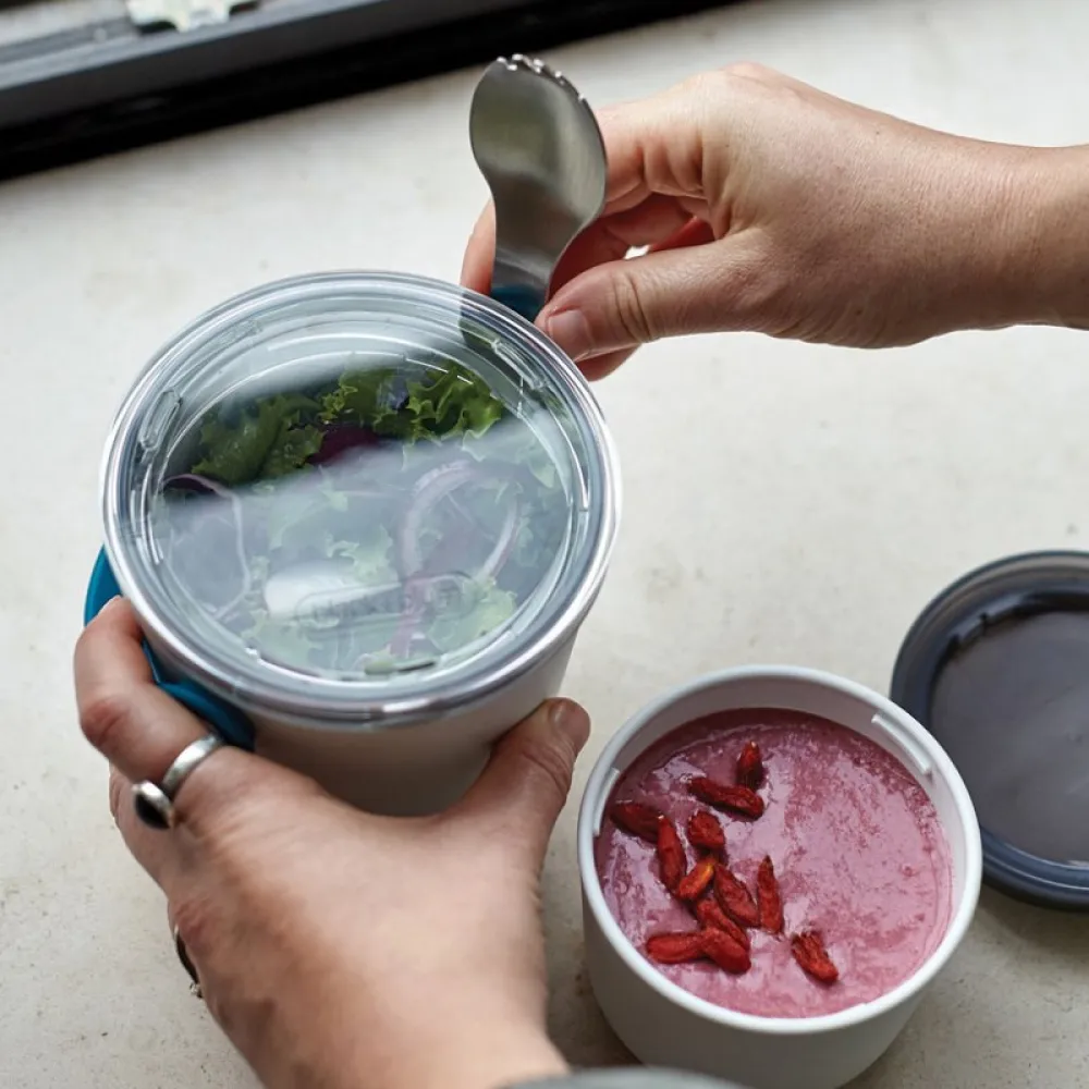 The pots have a convenient silicone carrying strap which also holds the stainless steel “spork” (spoon and fork). Separate anything from yoghurt and fruit to noodles and soup. When you’re finished, the smaller pot fits inside the larger pot for easy storage.