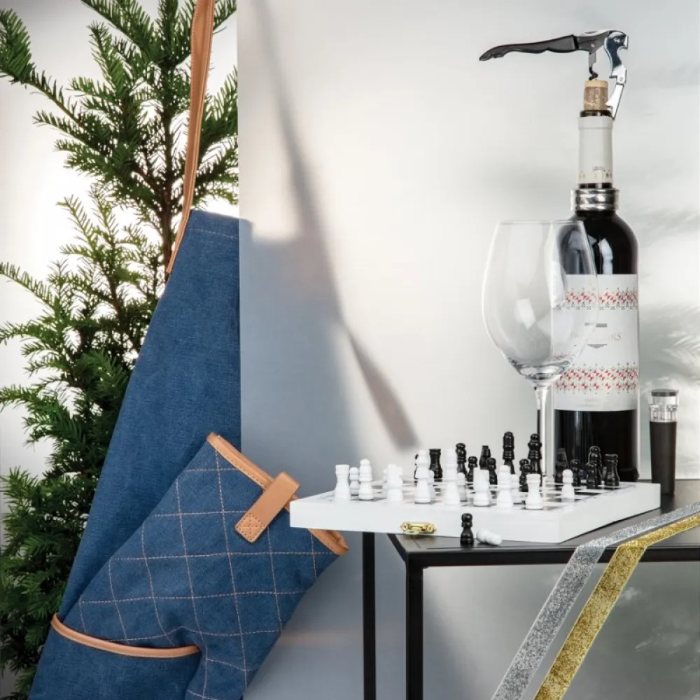 PU accent details. With a one-size design, it has adjustable straps at the neck and on the sides. A large pocket comes in handy for storing notes and utensils. Supplied in a Kraft gift box.