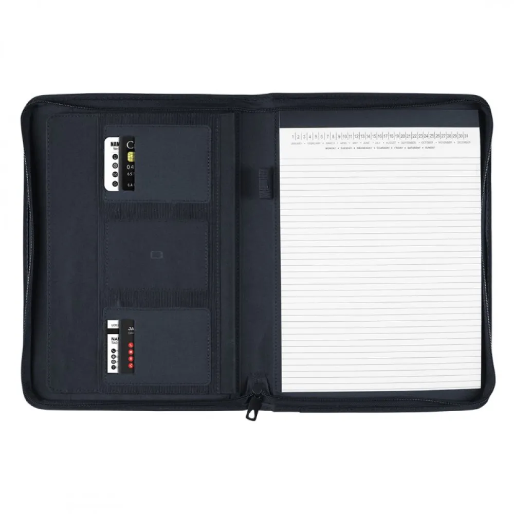Portfolio sa blokom za beleške A4 sa tekstilnom oblogom, dodatnim džepovima za kartice, dokumenta i mobilni telefon i držačem za olovku