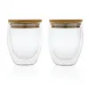 This double wall borosilicate glass set has a sleek 2 layer design which showcases all your favourite drinks! No matter what you serve, cappuccino, tea or latte will be nice and hot while your hand stays cool. Incudes a bamboo lid. It is recommended to handwash the glass and bamboo lid.