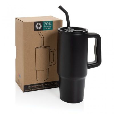 Experience the spacious yet conveniently portable embrace of our generously sized tumbler – not too big, not too small. Its comfort-grip handle and slim base make it a perfect fit for most cup holders, ensuring you stay refreshed whether you're enduring a long day of meetings, conquering a rowing class, or embarking on a trip out of town. Crafted from durable recycled stainless steel, this 900 ml. tumbler rises to the hydration challenge.