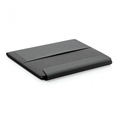 The sleek portfolio features a built-in wireless charging phone stand, elastic pen loop, 3 business cards alots and additional pockets.