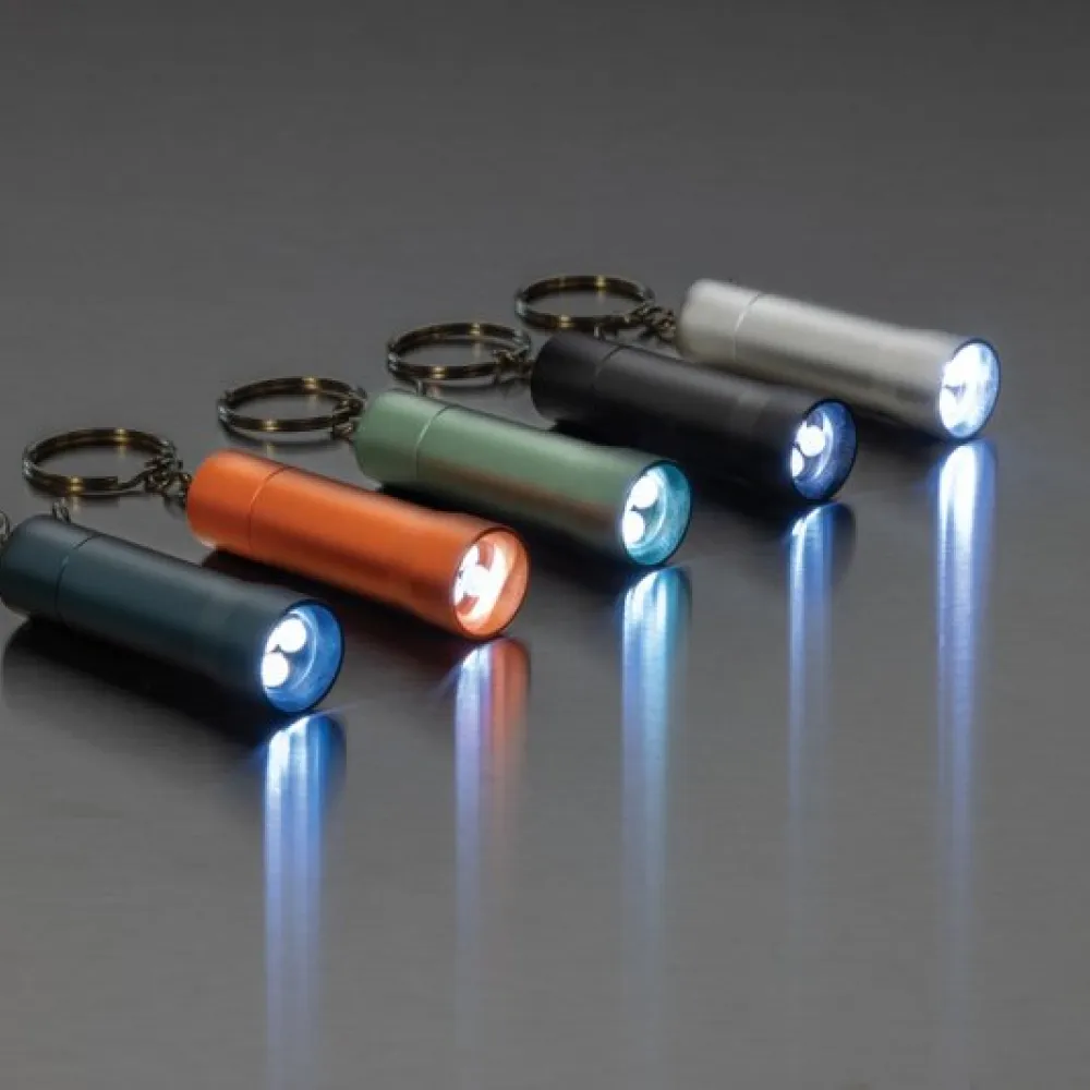 Total recycled content: 50% based on total item weight. RCS certification ensures a completely certified supply chain of the recycled materials. With 15 lumen that allow an operating time up to 6 hours on one set of batteries (included) With keychain.