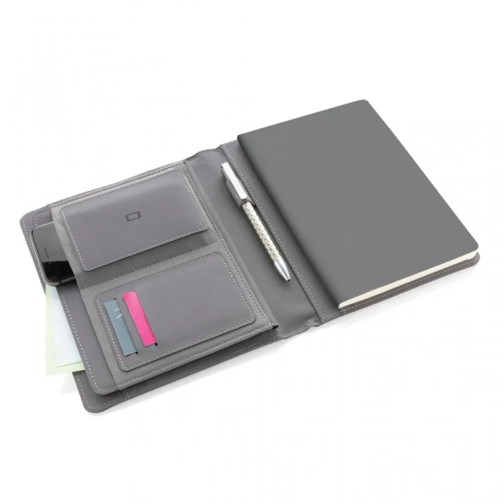 The notebook contains 64 sheets/128 sheets cream coloured lined 80gm/s FSC recycled paper. Inside you will find 1 big sleeve pocket, a phone pocket, 2 card slots and pen loop. Interior and exterior 100% recycled polyester with AWARE™ tracer.