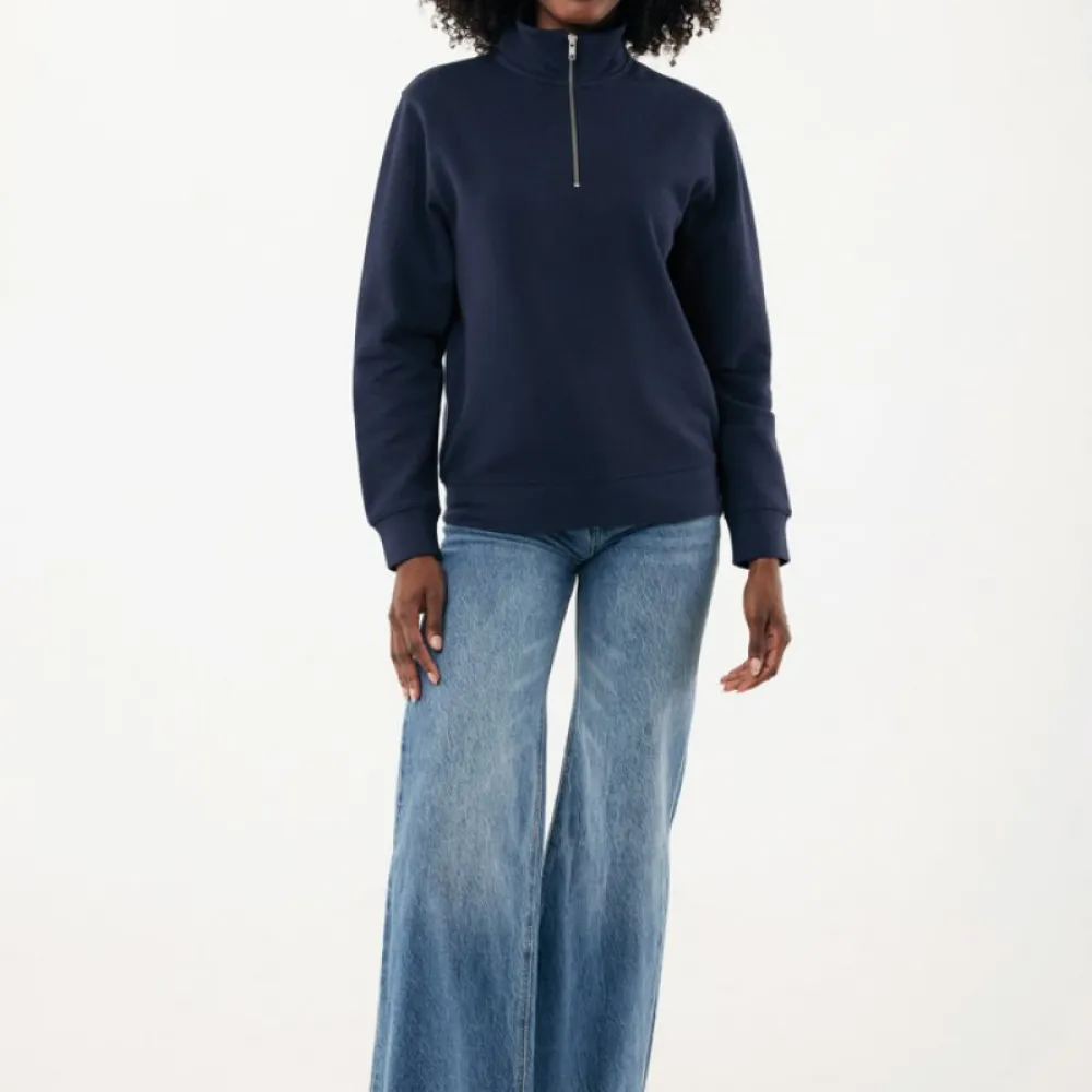 The quarter zip sweater has a self-fabric collar, set-in long sleeves and 1x1 rib at cuffs and hem.