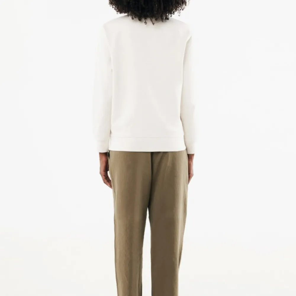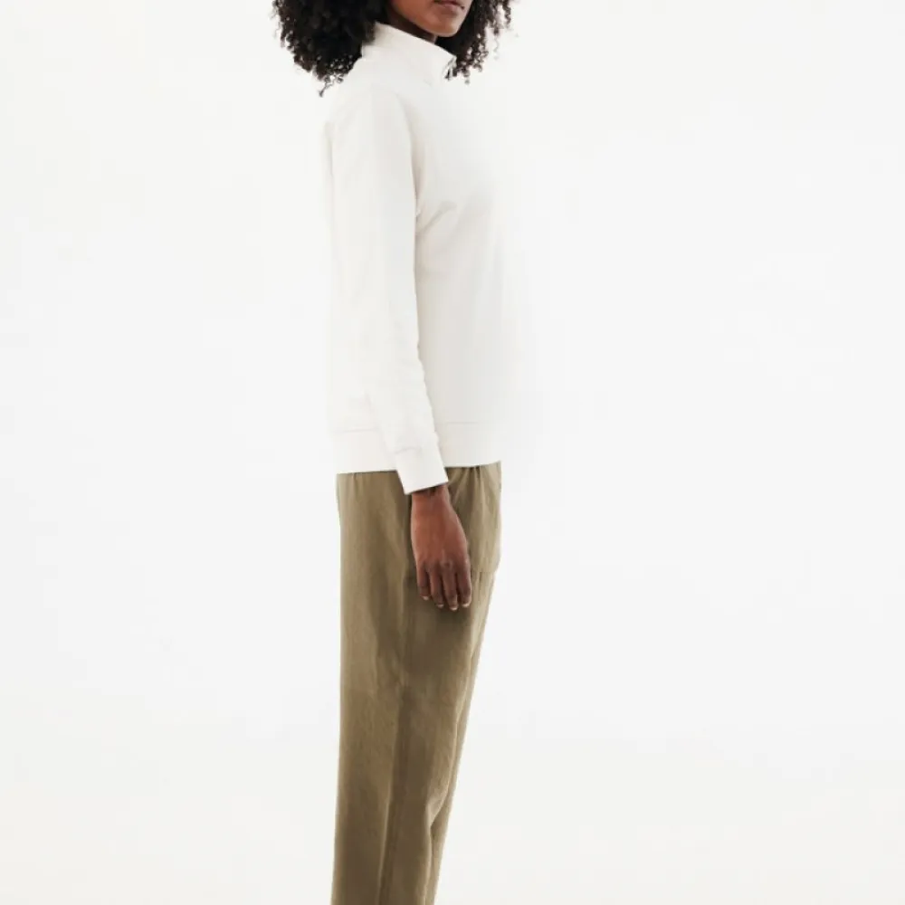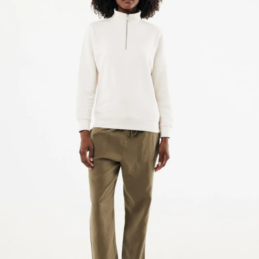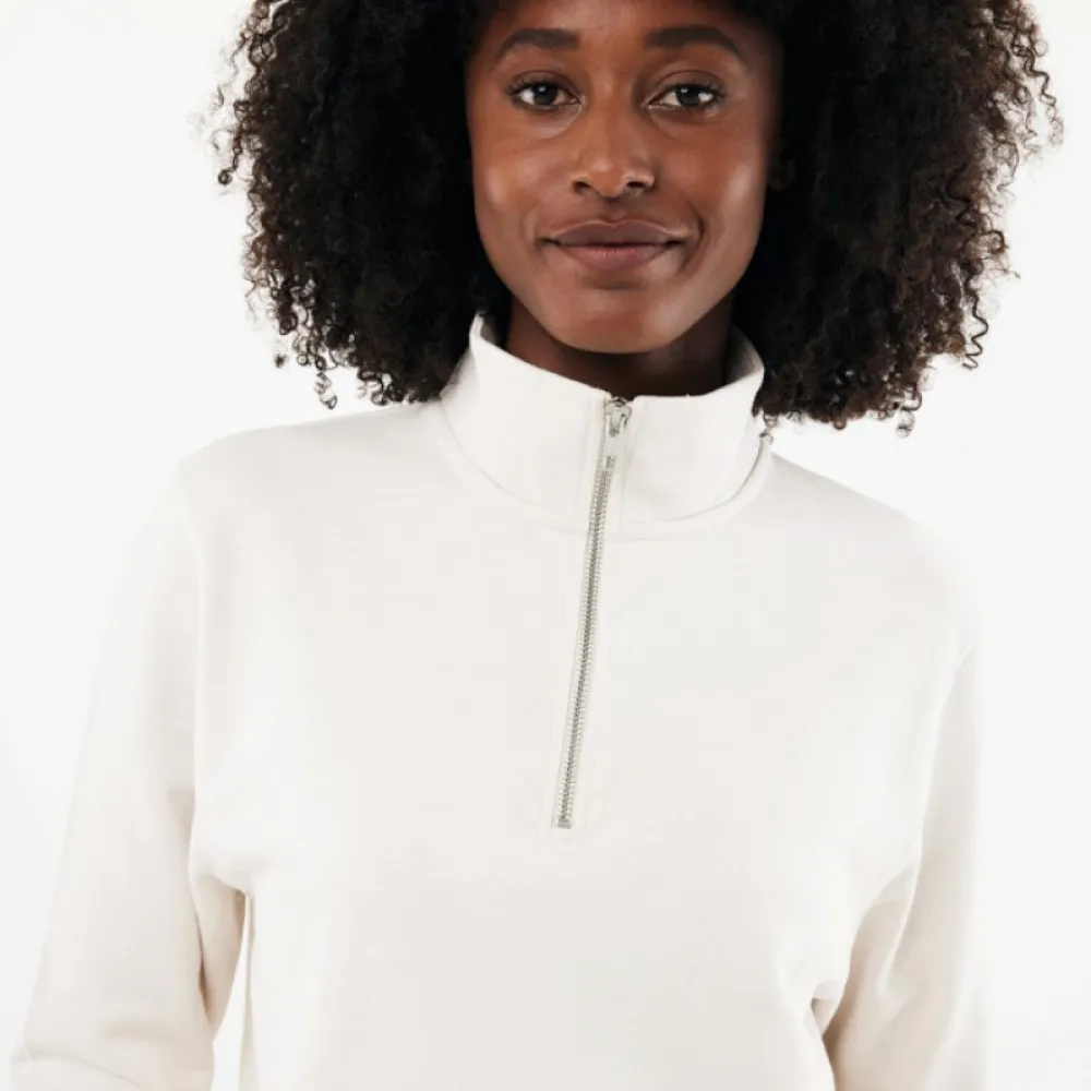 The quarter zip sweater has a self-fabric collar, set-in long sleeves and 1x1 rib at cuffs and hem.