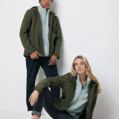 The jacket has a reversed zipper at the front and zip pockets in the side panel seams. It has an adjustable hood with inside stoppers for a better protection. Sleeve cuffs are adjustable with Velcro closing.