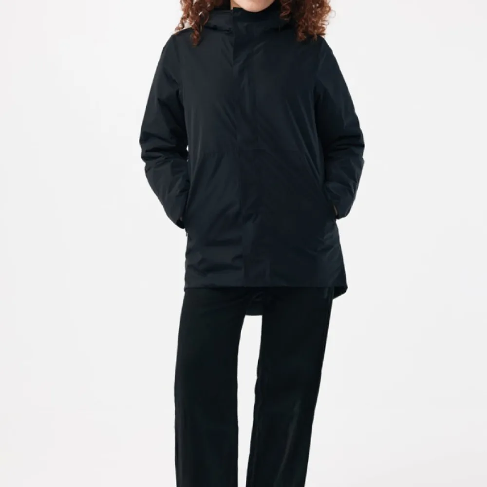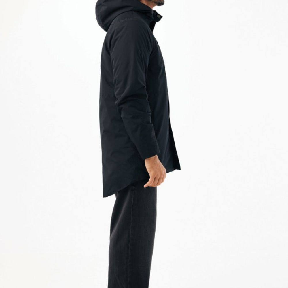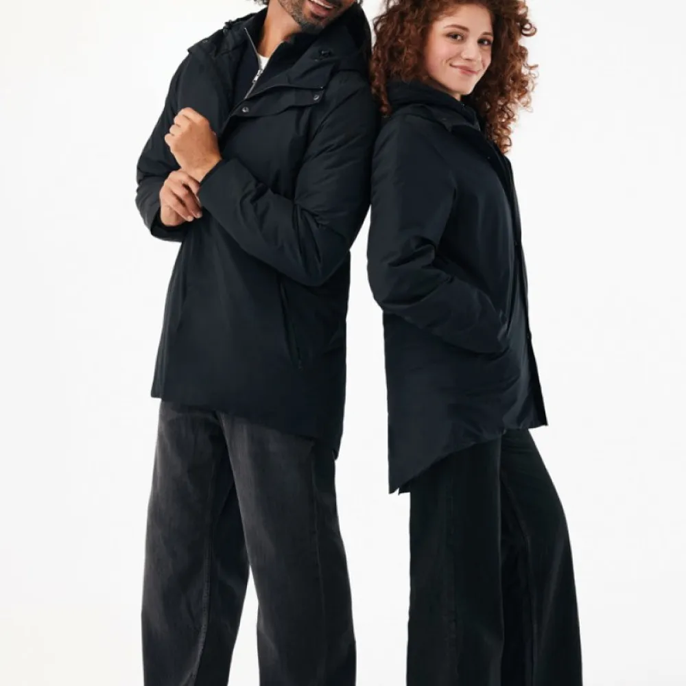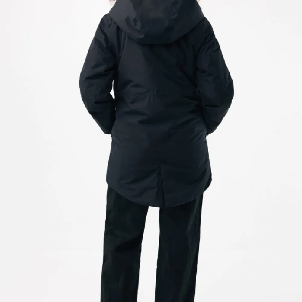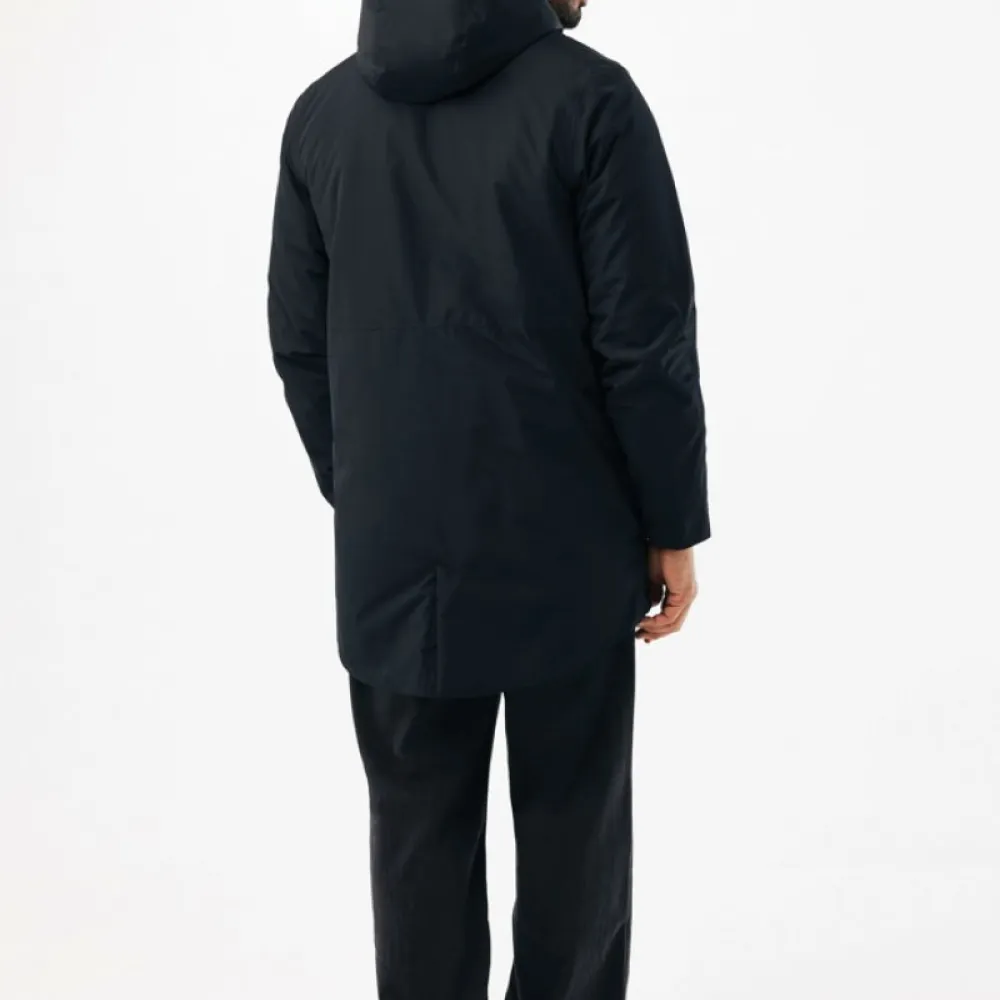 The jacket is 4.000 mm waterproof, breathable and wind resistant. It has all features of a classic parka: longer back length, back slit, 2-way CF reversed zipper, covered by an extra front placket with four hidden snaps, clean sleeve cuffs with an extra inside half cuff, hood with stoppers at inside collar, horizontal deco seams. It is padded with 100% recycled polyester sheets and is lined with fine taffeta. On the inside there is a hidden zip at bottom hem and left wearer’s chest for easy decoration. Full garment is stitched with recycled polyester sewing thread. At back neck there is a tear-off size label with an iqoniq craft hangtag, care label at the left inside side seam.