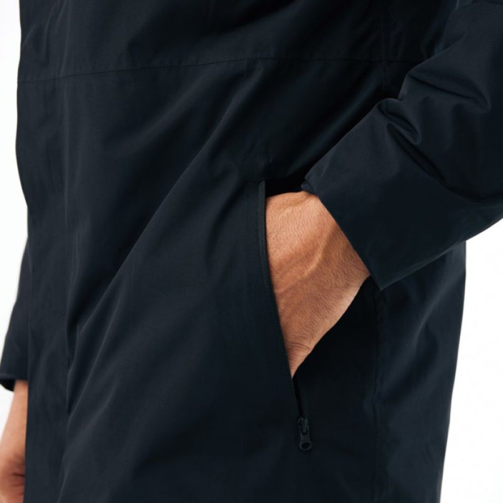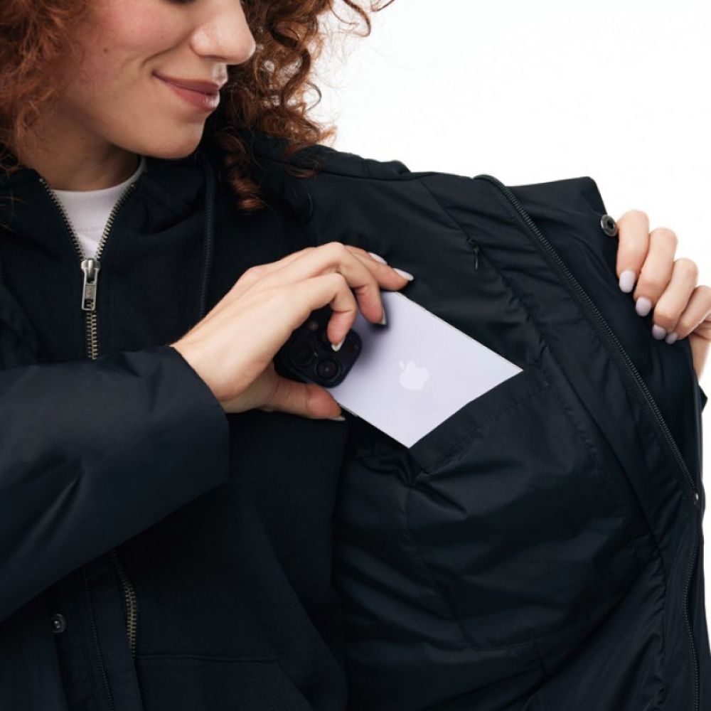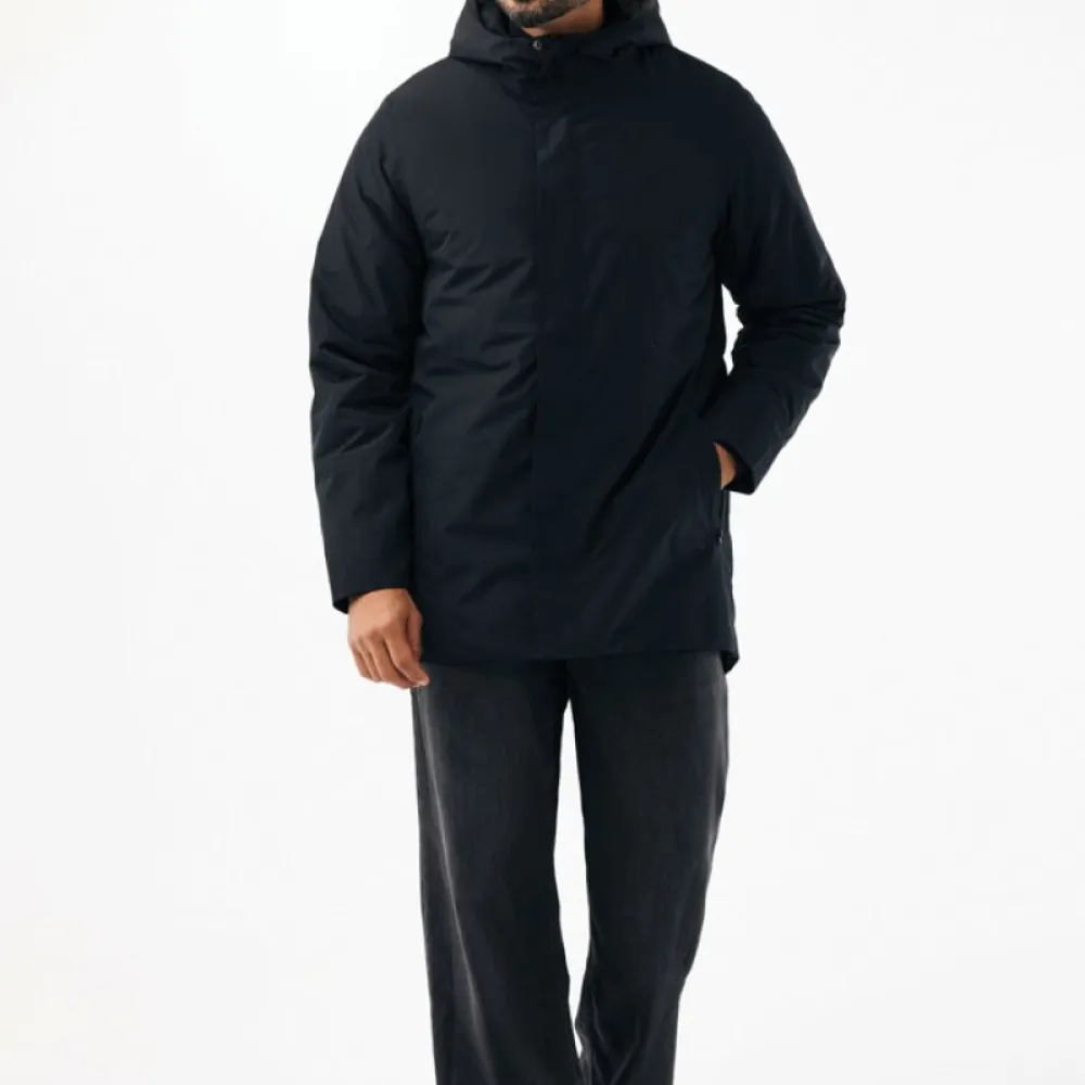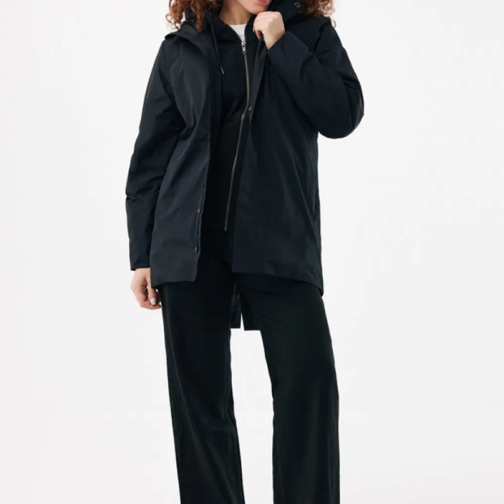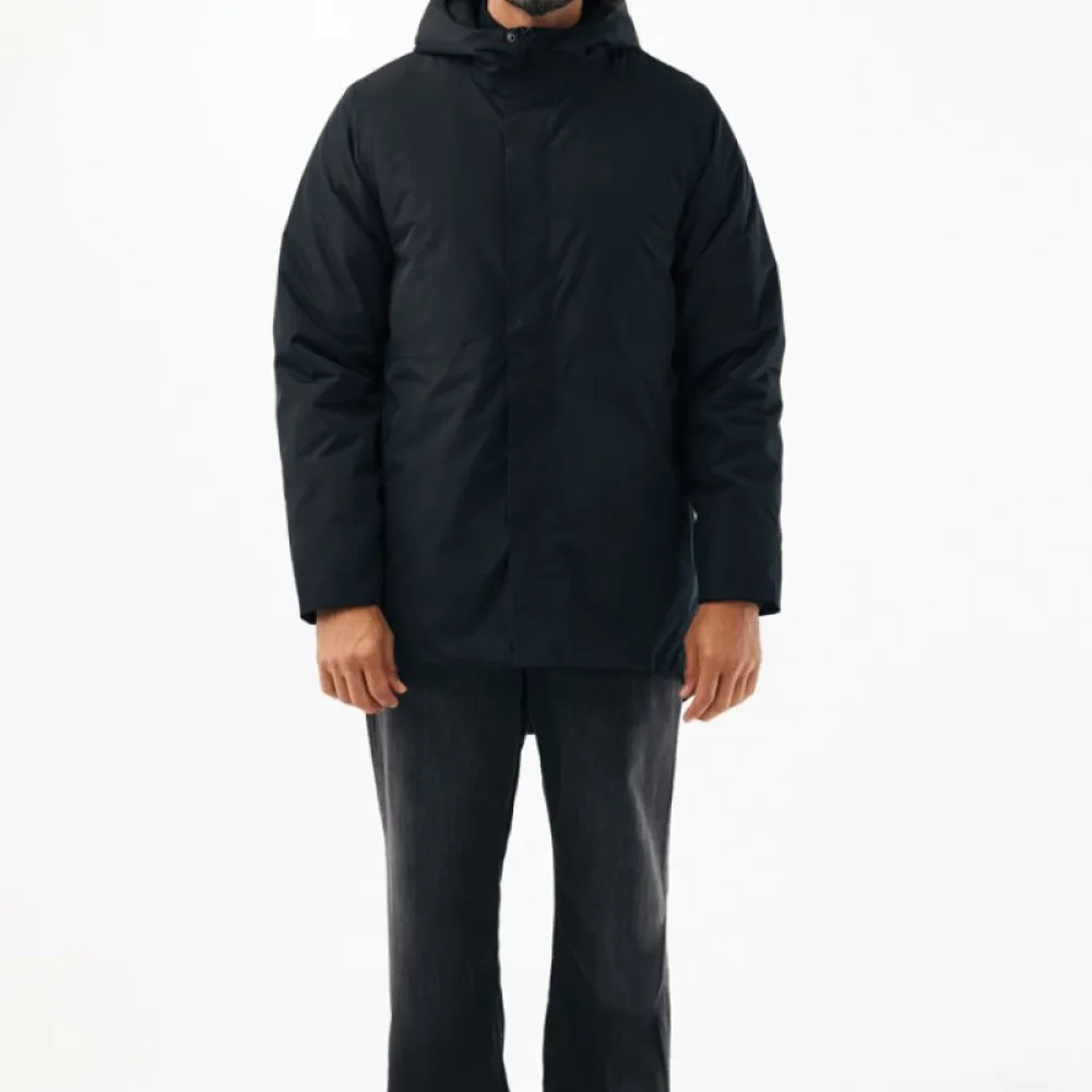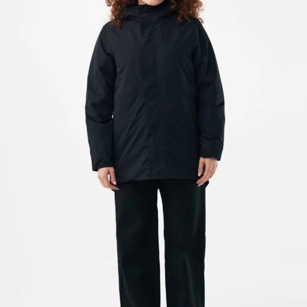The jacket is 4.000 mm waterproof, breathable and wind resistant. It has all features of a classic parka: longer back length, back slit, 2-way CF reversed zipper, covered by an extra front placket with four hidden snaps, clean sleeve cuffs with an extra inside half cuff, hood with stoppers at inside collar, horizontal deco seams. It is padded with 100% recycled polyester sheets and is lined with fine taffeta. On the inside there is a hidden zip at bottom hem and left wearer’s chest for easy decoration. Full garment is stitched with recycled polyester sewing thread. At back neck there is a tear-off size label with an iqoniq craft hangtag, care label at the left inside side seam.
