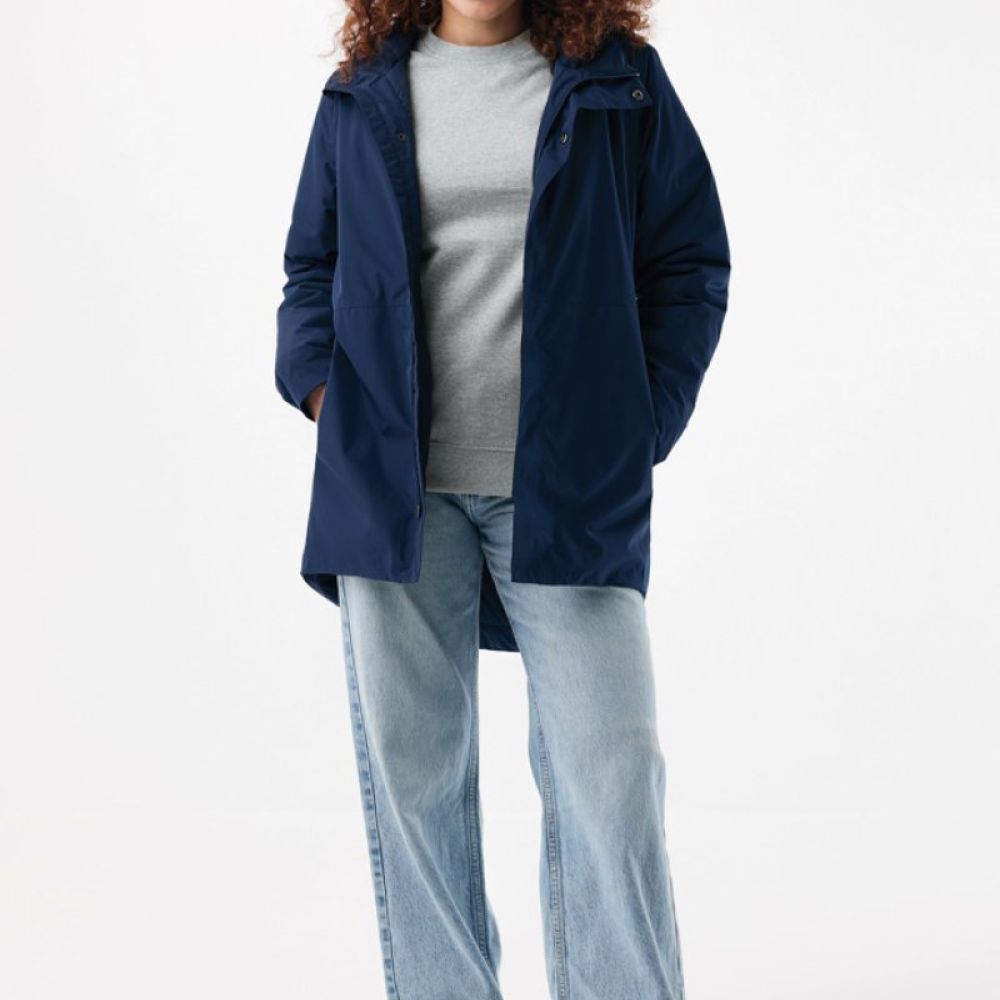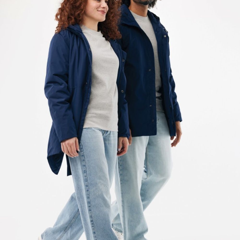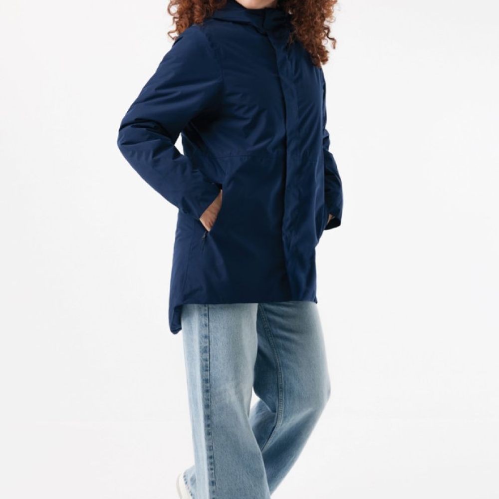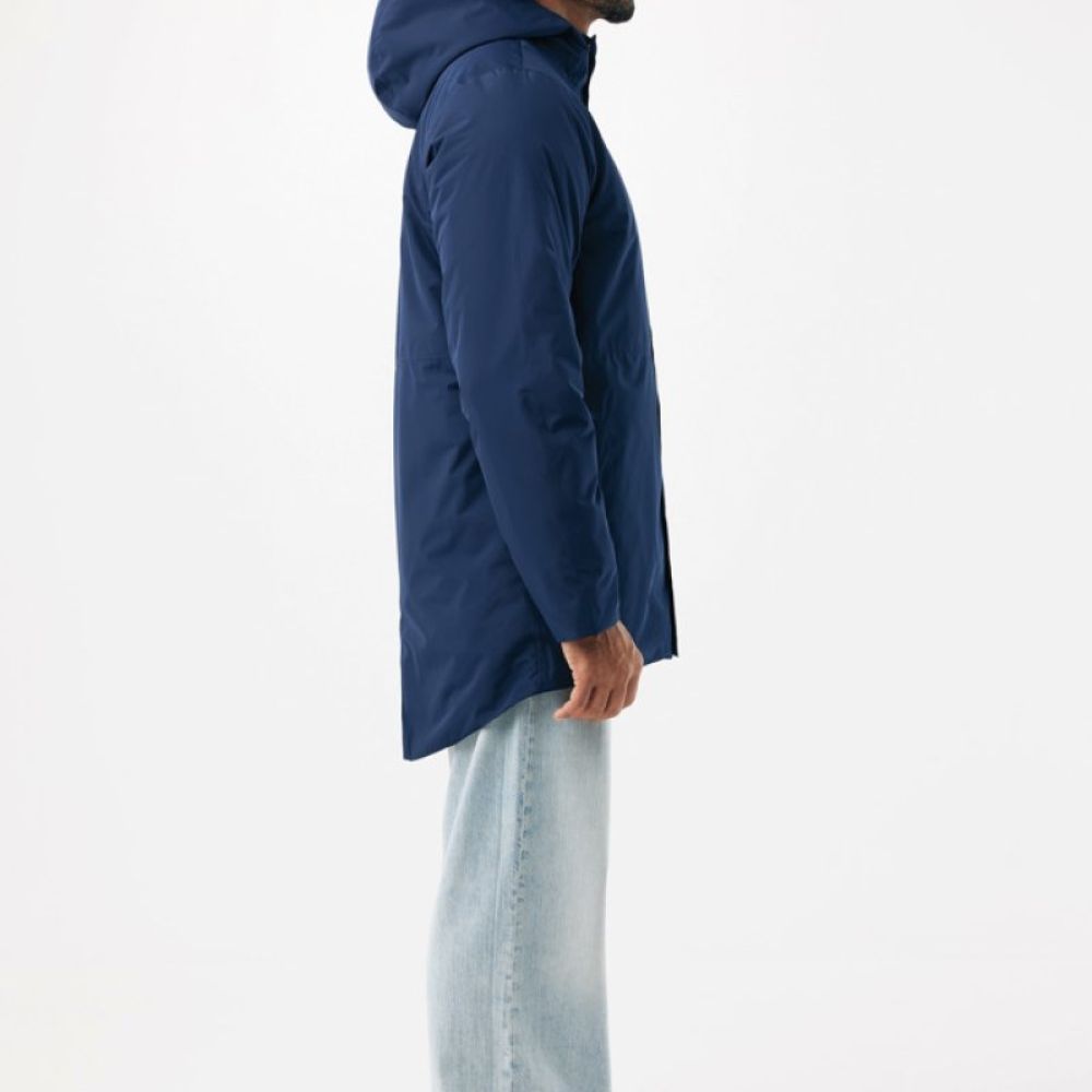 The jacket is 4.000 mm waterproof, breathable and wind resistant. It has all features of a classic parka: longer back length, back slit, 2-way CF reversed zipper, covered by an extra front placket with four hidden snaps, clean sleeve cuffs with an extra inside half cuff, hood with stoppers at inside collar, horizontal deco seams. It is padded with 100% recycled polyester sheets and is lined with fine taffeta. On the inside there is a hidden zip at bottom hem and left wearer’s chest for easy decoration. Full garment is stitched with recycled polyester sewing thread. At back neck there is a tear-off size label with an iqoniq craft hangtag, care label at the left inside side seam.