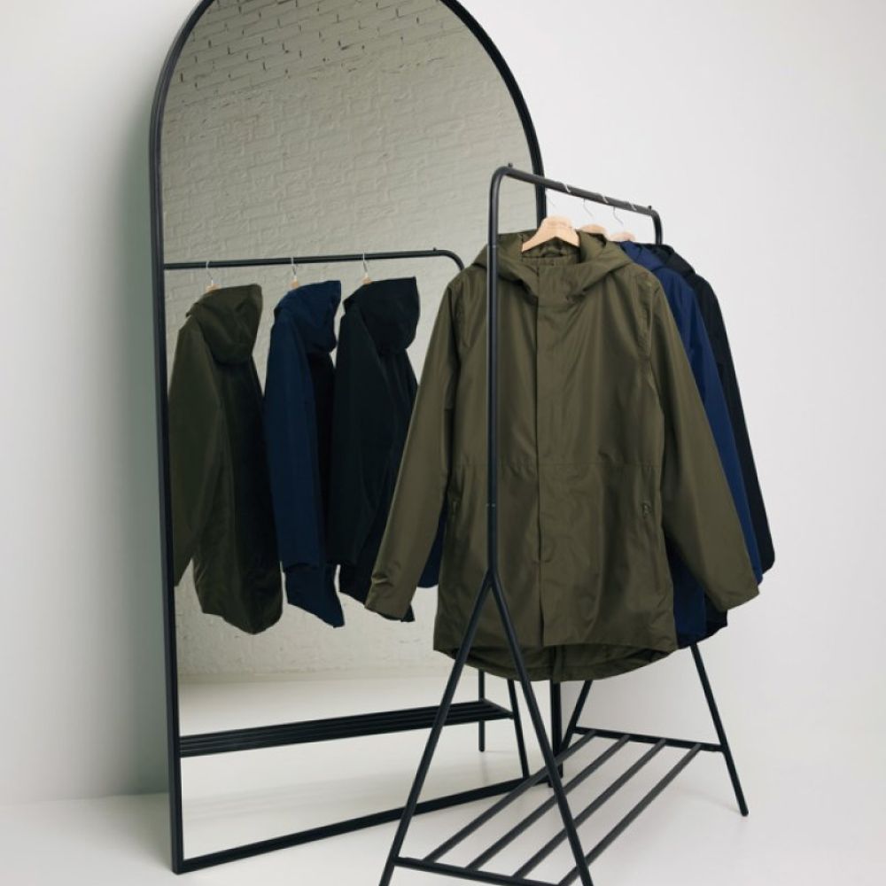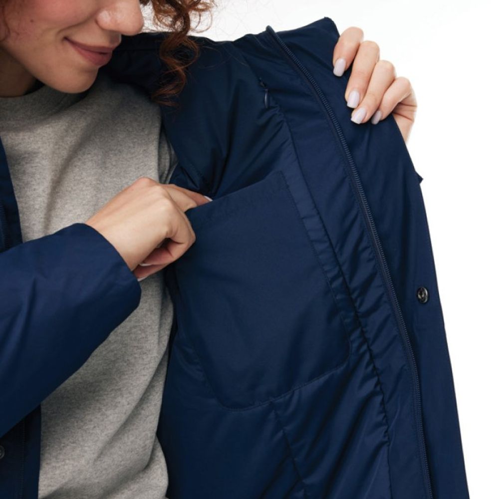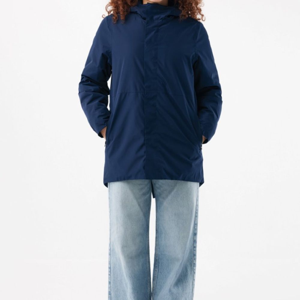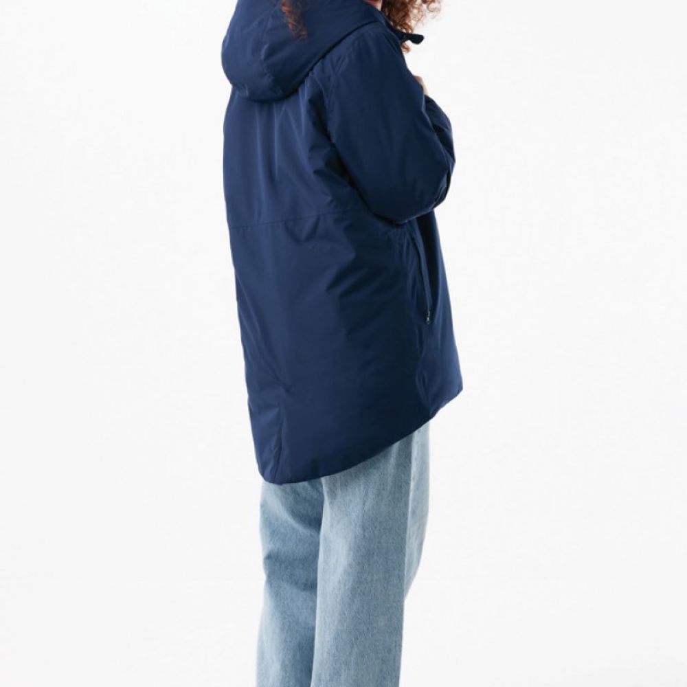 The jacket is 4.000 mm waterproof, breathable and wind resistant. It has all features of a classic parka: longer back length, back slit, 2-way CF reversed zipper, covered by an extra front placket with four hidden snaps, clean sleeve cuffs with an extra inside half cuff, hood with stoppers at inside collar, horizontal deco seams. It is padded with 100% recycled polyester sheets and is lined with fine taffeta. On the inside there is a hidden zip at bottom hem and left wearer’s chest for easy decoration. Full garment is stitched with recycled polyester sewing thread. At back neck there is a tear-off size label with an iqoniq craft hangtag, care label at the left inside side seam.