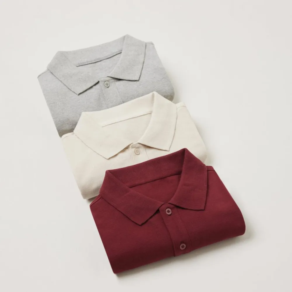 The polo has a front placket with two buttons in matching colour and 1x1 flat rib.