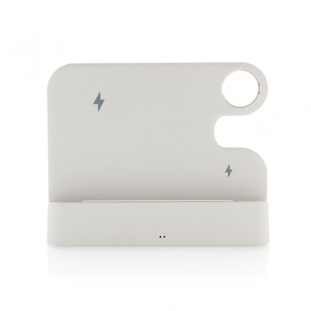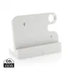 Foldable design charging stand with 15W wireless charger made with recycled ABS. With second 5W wireless charger to charge smaller objects like earbuds. With iWatch slot to fit the official charging cable for iWatch. On the backside there is a 5V/1A USB A and USB C output port to charge items by cable. With silicon tips on the bottom to avoid slipping and silicon cushioning to the stand to keep your phone in perfect condition.