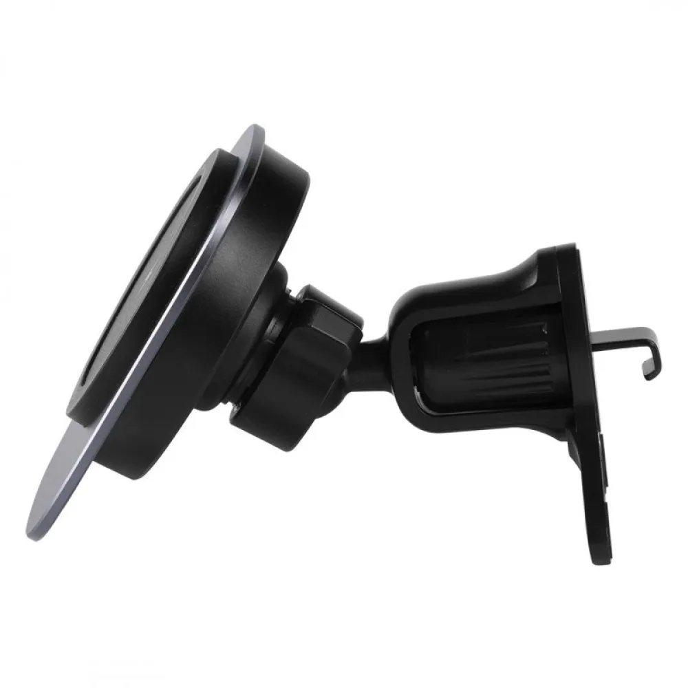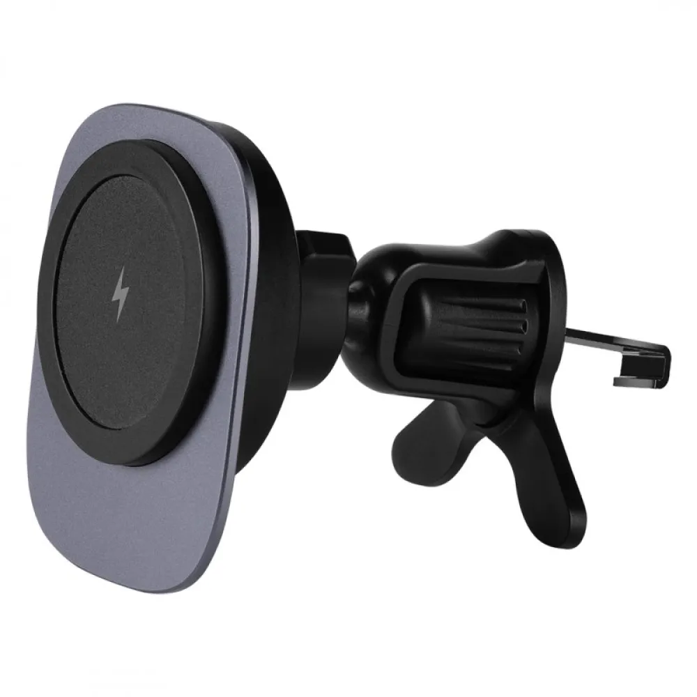 Magnetni držač i bežični punjač za mobilne telefone namenjen upotrebi u automobilu, sa sistemom kačenja na ventilacione otvore. Omogućava stabilno držanje telefona i efikasno bežično punjenje snage do 15W. Izrađen je od kombinacije aluminijuma i plastike, što obezbeđuje dobru izdržljivost i moderan izgled. Kompatibilan je sa različitim režimima bežičnog punjenja, a