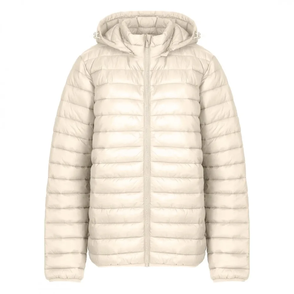 Štepana jakna sa kapuljačom, lagano punjenje, dva prednja džepa, elastični paspuli oko ramena i džepova, vrećica za pakovanje