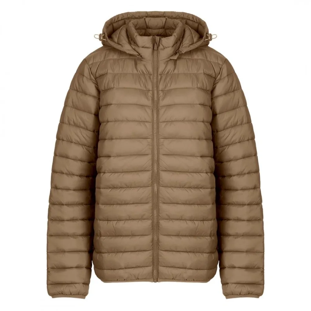 Štepana jakna sa kapuljačom, lagano punjenje, dva prednja džepa, elastični paspuli oko ramena i džepova, vrećica za pakovanje