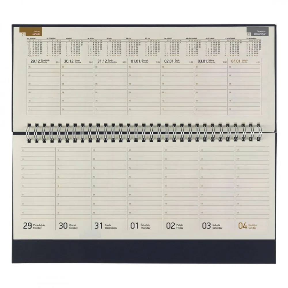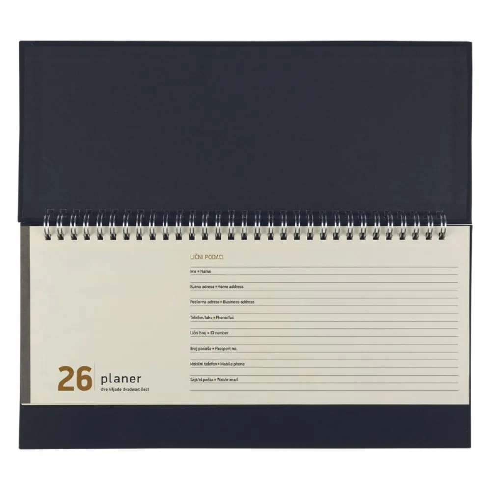 Prednji deo sadrži prostor za upisivanje ličnih podataka, trogodišnji kalendar i informacije o vremenskim zonama Srednji deo je datumiran u vidu nedeljnog planera Zadnji deo sadrži mesečni planer, adresar i deo za beleške