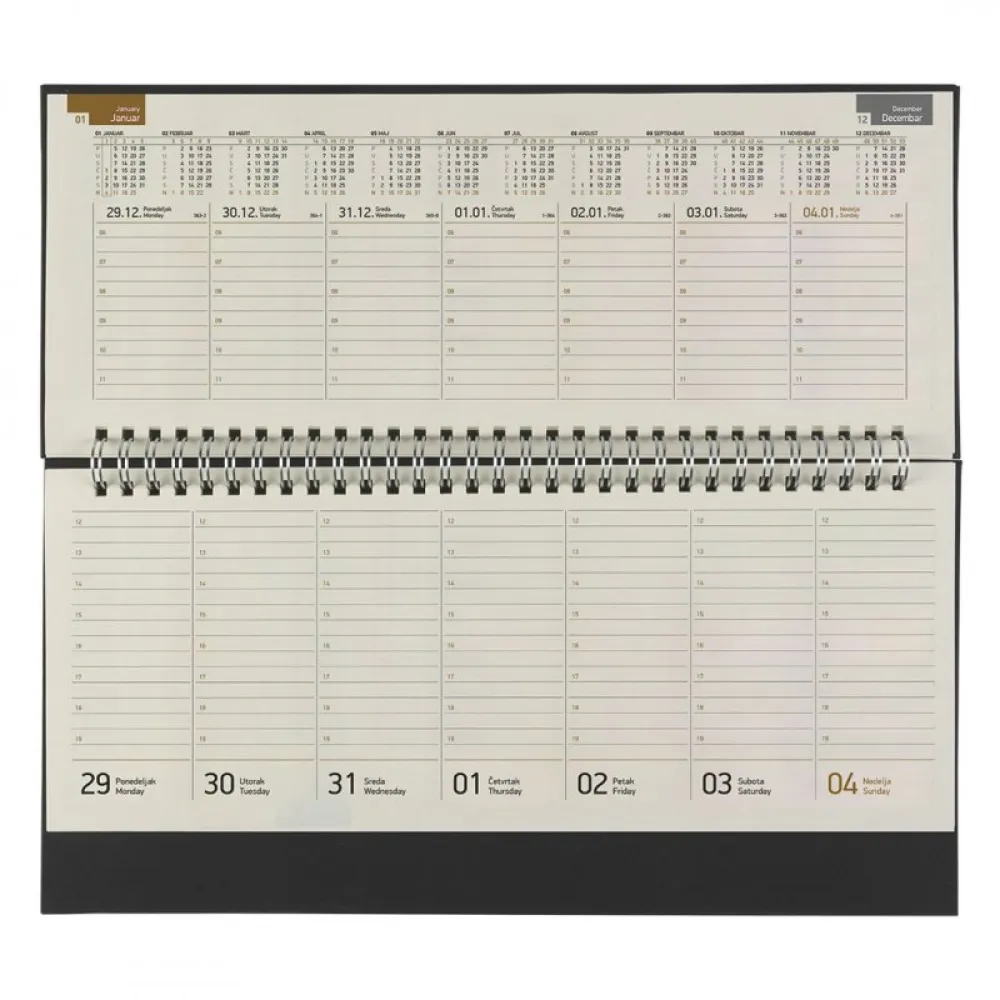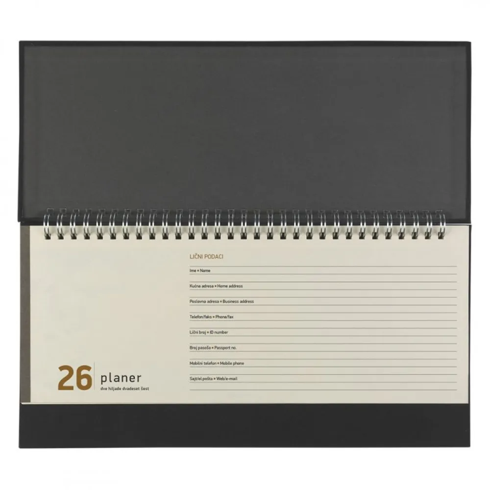 Prednji deo sadrži prostor za upisivanje ličnih podataka, trogodišnji kalendar i informacije o vremenskim zonama Srednji deo je datumiran u vidu nedeljnog planera Zadnji deo sadrži mesečni planer, adresar i deo za beleške