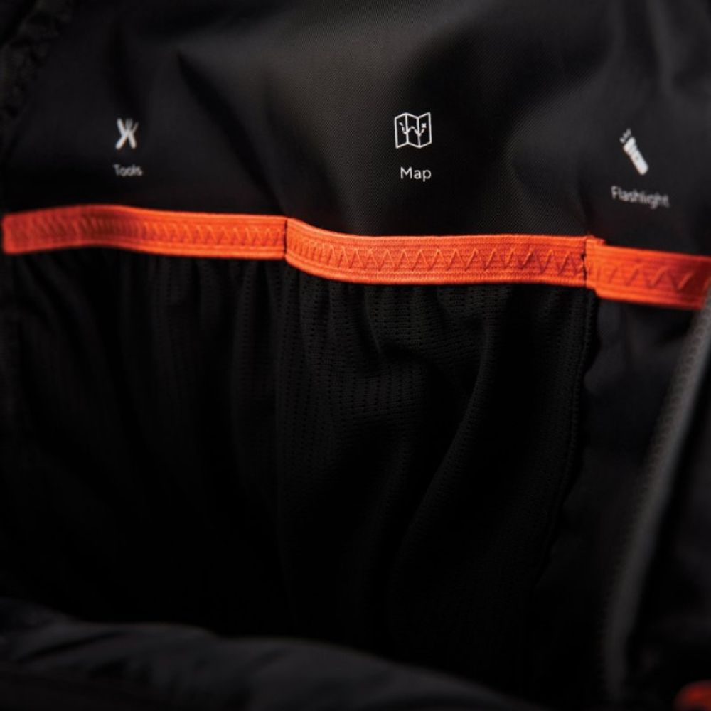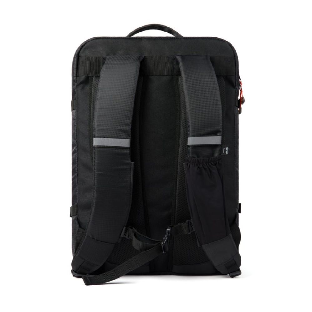 Made from RCS-certified recycled polyester with black finish and orange accents. Features trolley-style main compartment with straps and mesh zip pocket, 15.6" laptop compartment with elastic mesh pockets, top pocket, reflective logo, and adjustable compression straps. Ergonomic mesh back with adjustable shoulder and chest straps. Fully traceable via