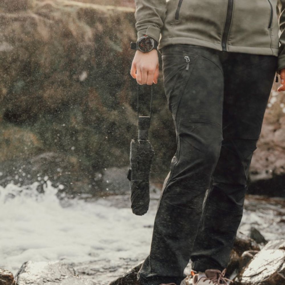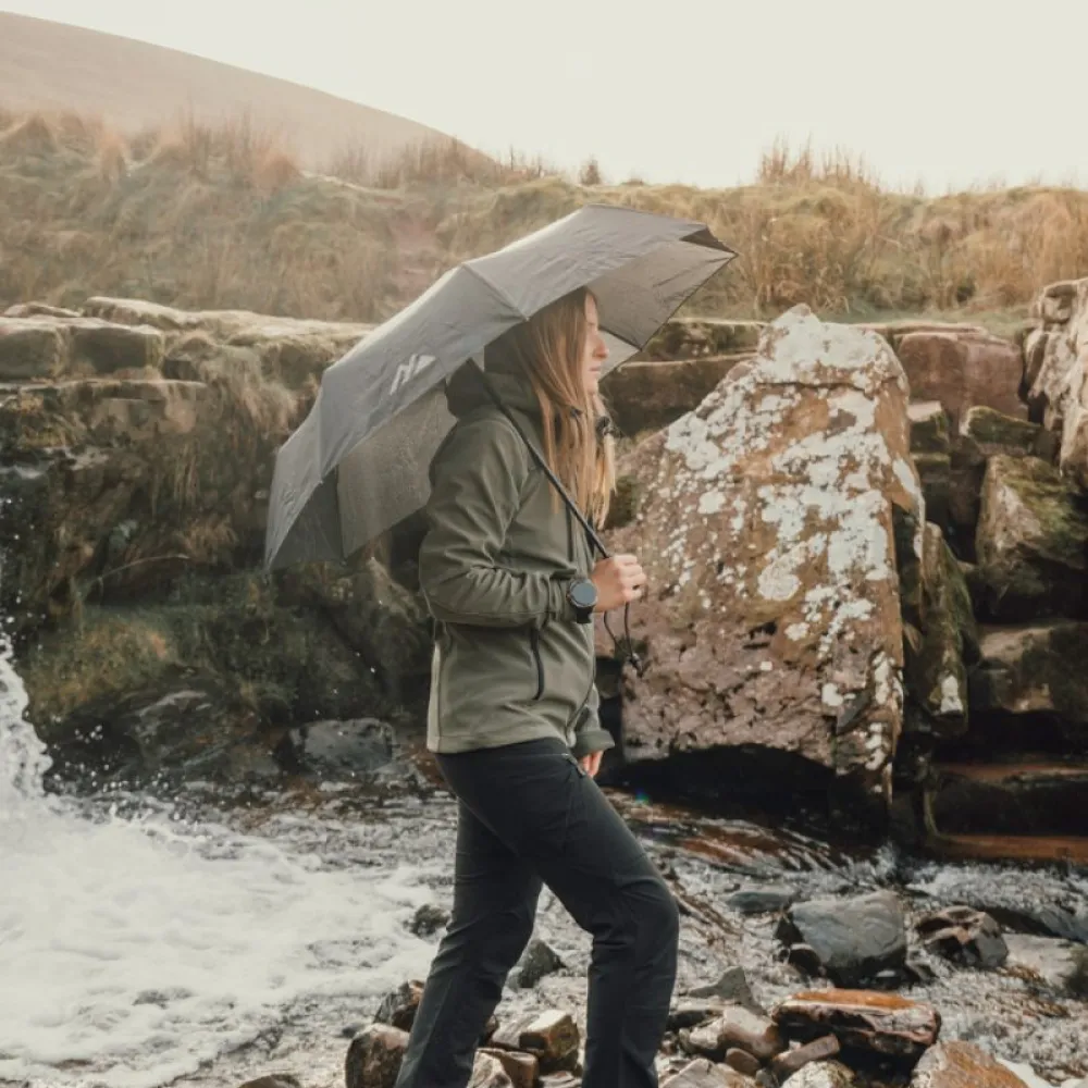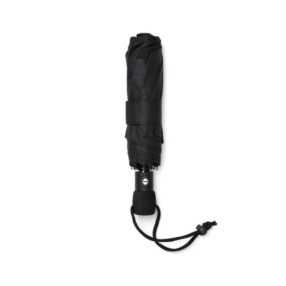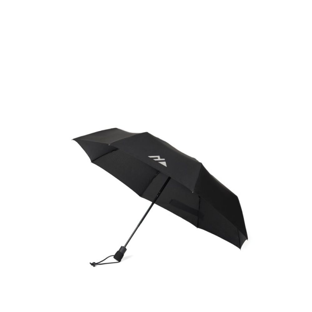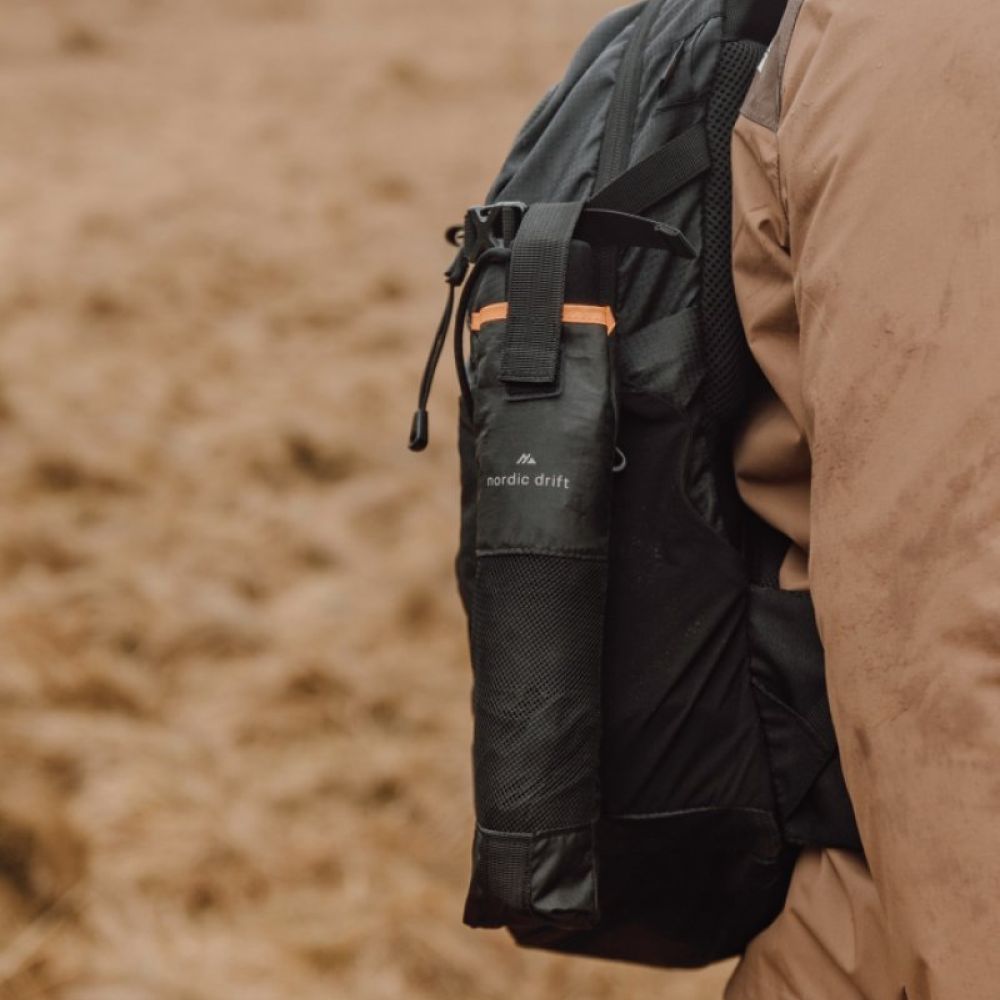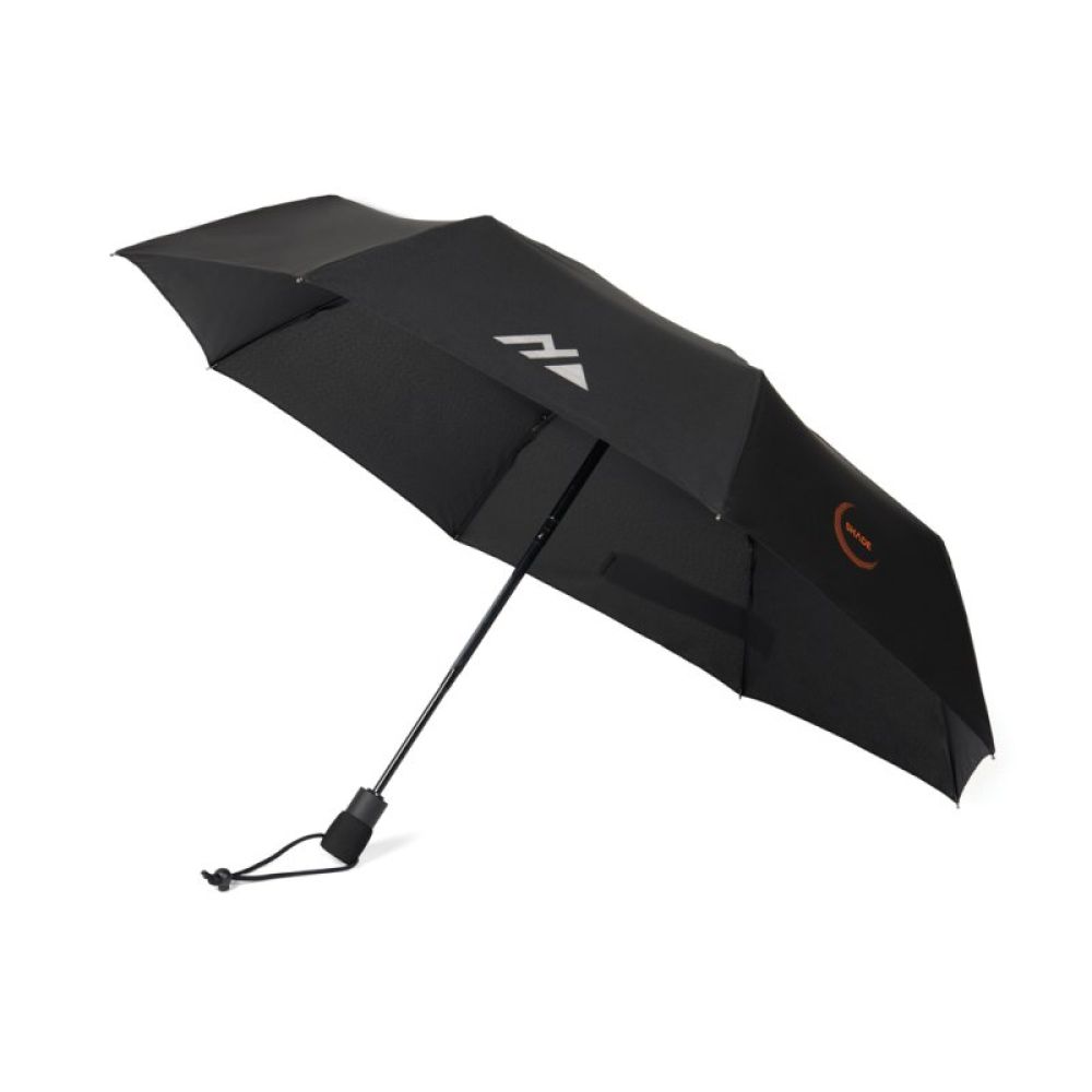 Made from 100% rPET 190T with AWARE™ tracer, steel shaft, fibreglass ribs (8 panels), and auto open/close function. Compact (31.5ר7 cm folded, canopy Ø116 cm, 376 g) with EVA handle, adjustable strap, metal tip, and reflective Nordic