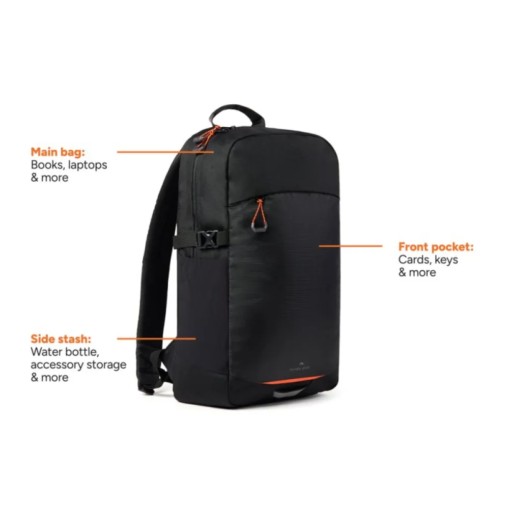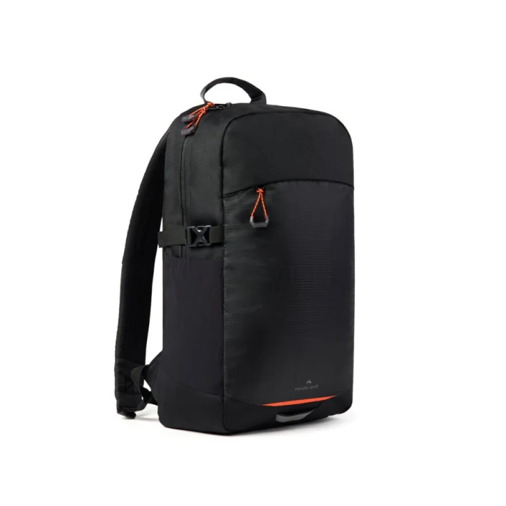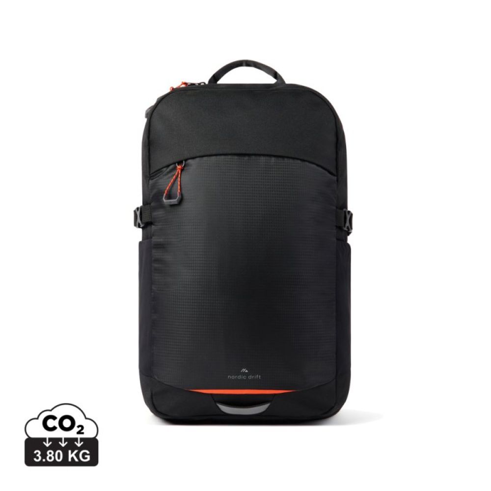 Made from RCS-certified recycled polyester with black and orange accents. Features main compartment with laptop pocket, elastic side pockets, front zipper pocket, side bottle holders, adjustable straps, ergonomic mesh back, and reflective Nordic