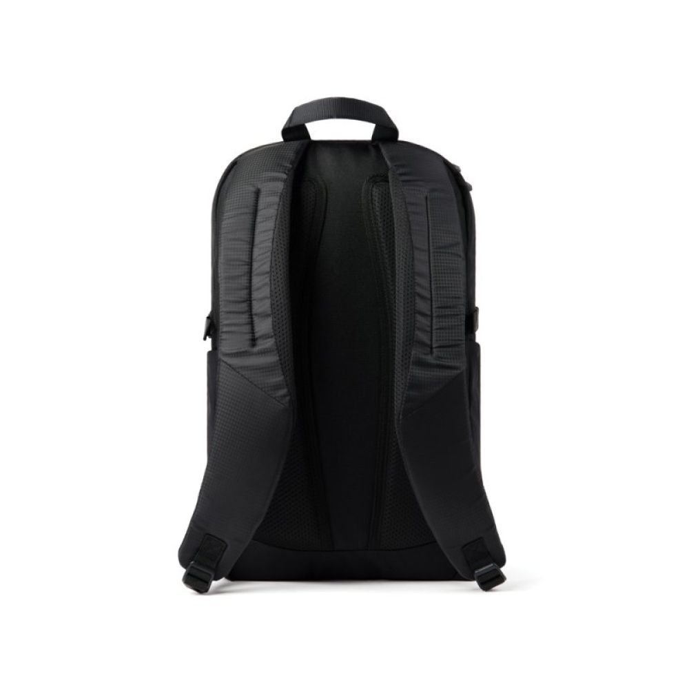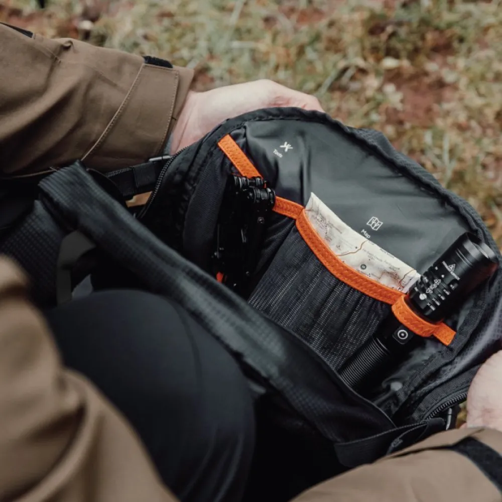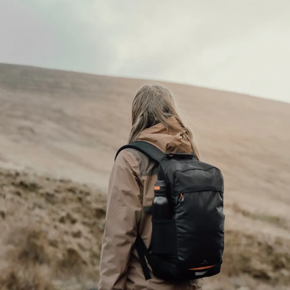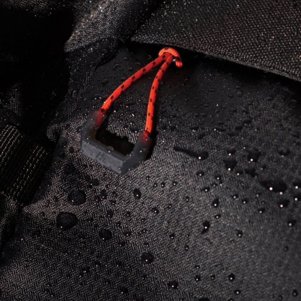 Made from RCS-certified recycled polyester with black and orange accents. Features main compartment with laptop pocket, elastic side pockets, front zipper pocket, side bottle holders, adjustable straps, ergonomic mesh back, and reflective Nordic