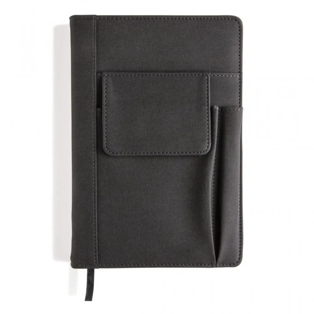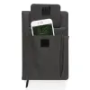 PU notebook cover with a front phone pocket (14 x 10cm), pen pocket and one main pocket .