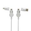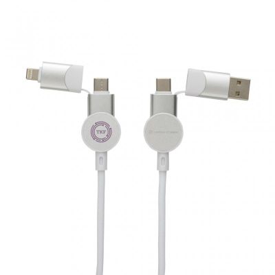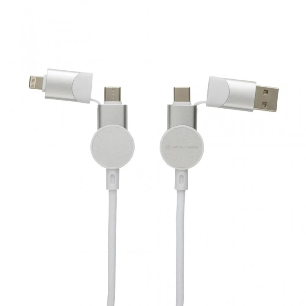 The 120 cm cable has 5 different connectors: USB C in, USB A in, type C out, IOS out and micro USB out.