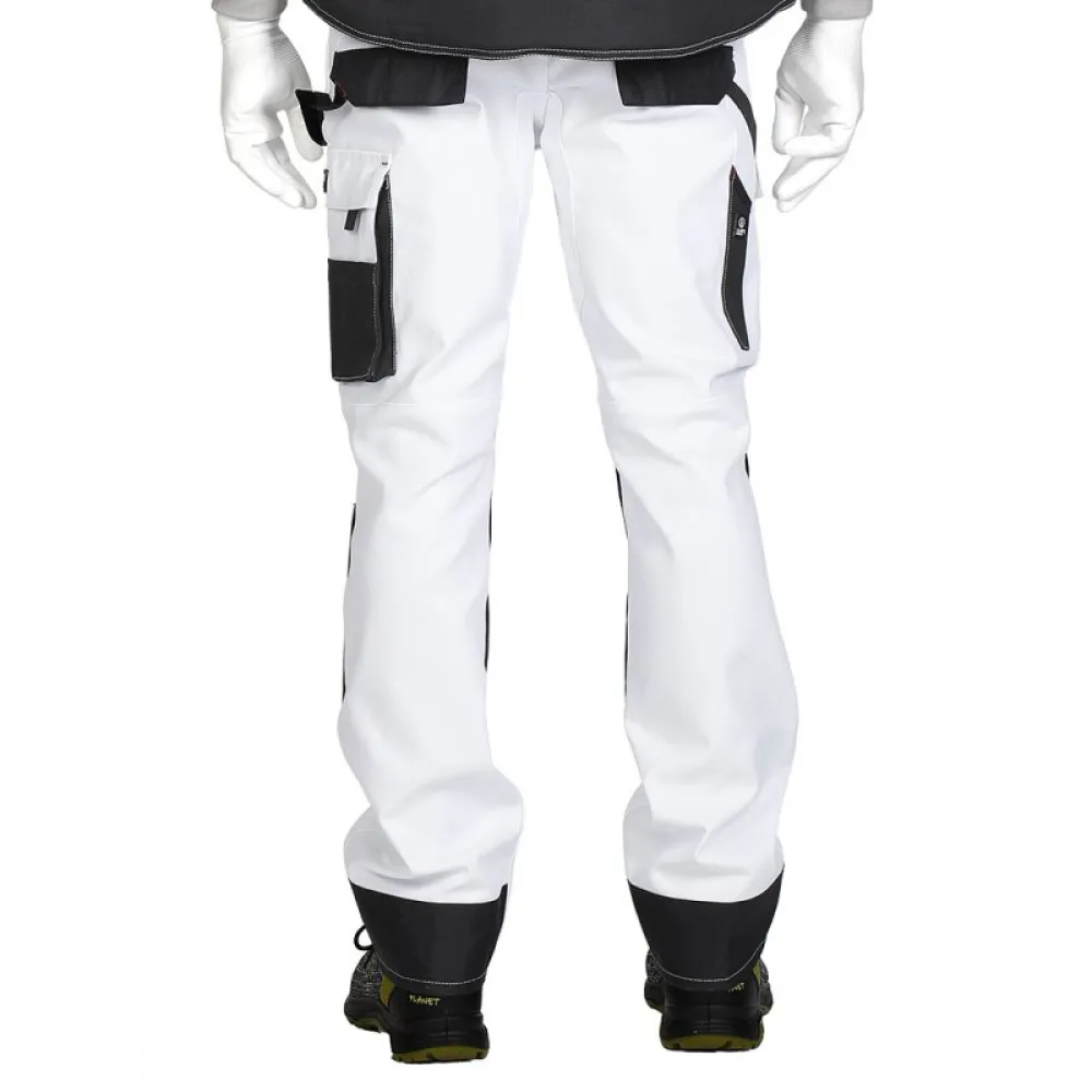 Radne pantalone, 300g/m2 platno prepletaj, ojačanja od 900D poliestera na mestima izloženim većem habanju (džepovi, kolena), džepovi za umetanje štitnika za kolena, četiri prednja džepa (dva sa rajsferšlusom), dva džepa pozadi i dva sa strane sa praktičnim odeljcima za alat, gajka za čekić, plastične alke za ključeve, pojas sa čičak trakom za podešavanje širine u struku za dodatnu udobnost, trostruki štepovi kao ojačanje