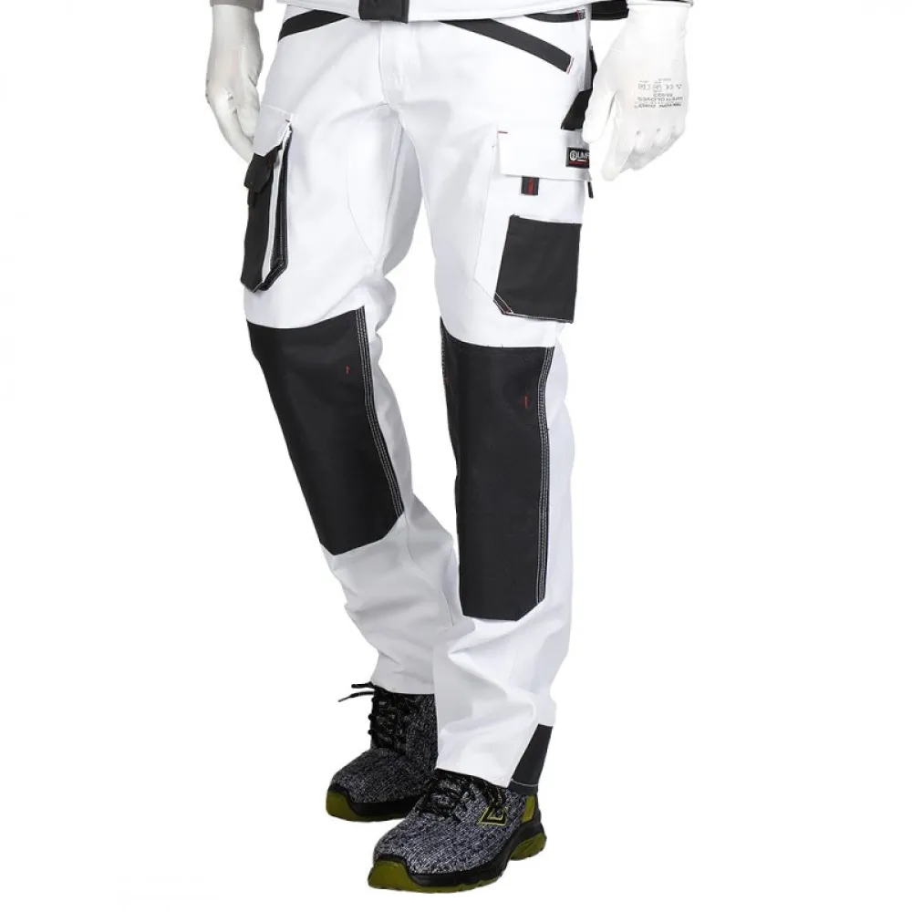 Radne pantalone, 300g/m2 platno prepletaj, ojačanja od 900D poliestera na mestima izloženim većem habanju (džepovi, kolena), džepovi za umetanje štitnika za kolena, četiri prednja džepa (dva sa rajsferšlusom), dva džepa pozadi i dva sa strane sa praktičnim odeljcima za alat, gajka za čekić, plastične alke za ključeve, pojas sa čičak trakom za podešavanje širine u struku za dodatnu udobnost, trostruki štepovi kao ojačanje