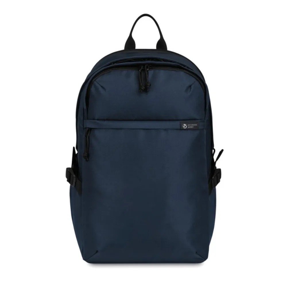 A modern and sustainable update to a classic computer backpack using recycled fabric and webbing made from plastic bottles.