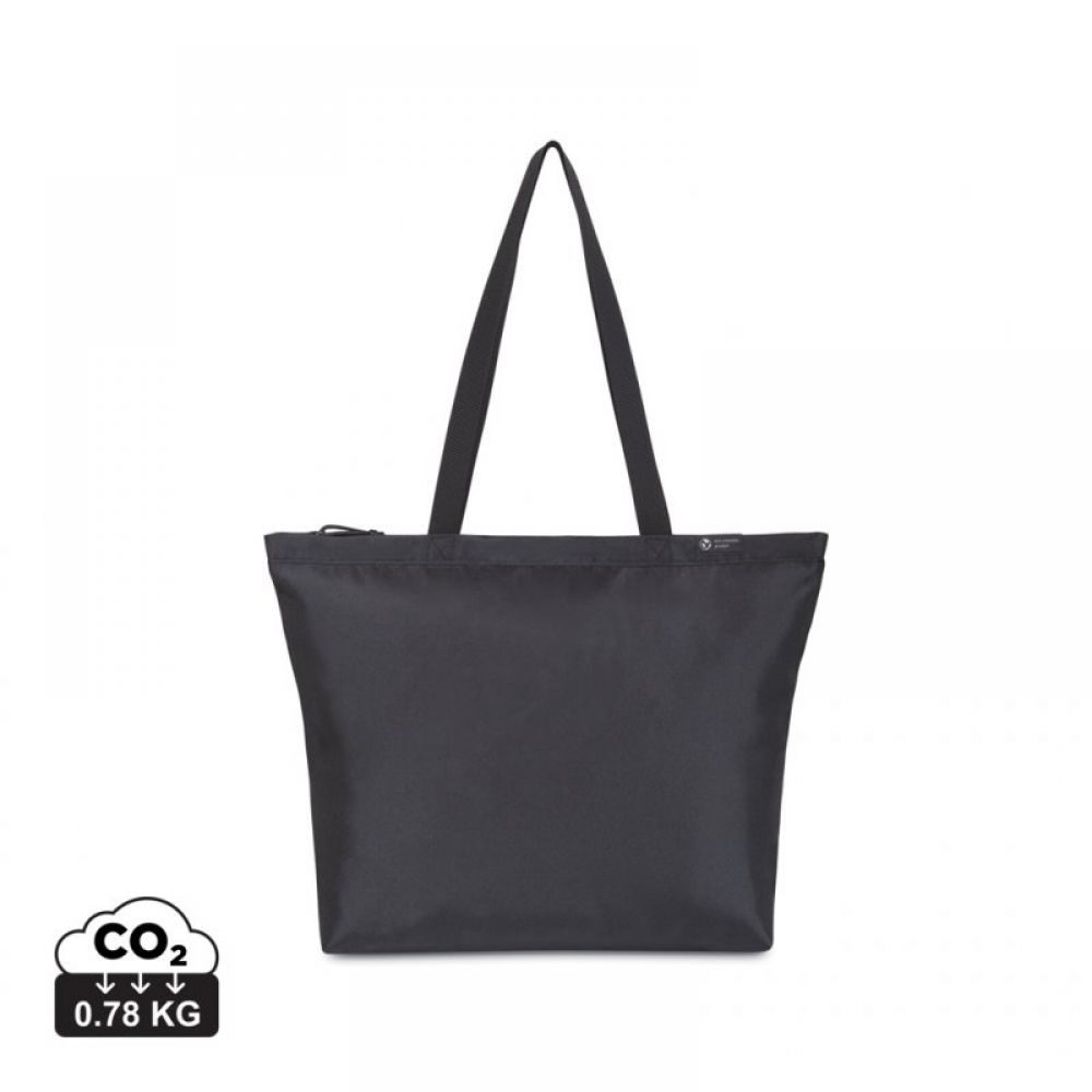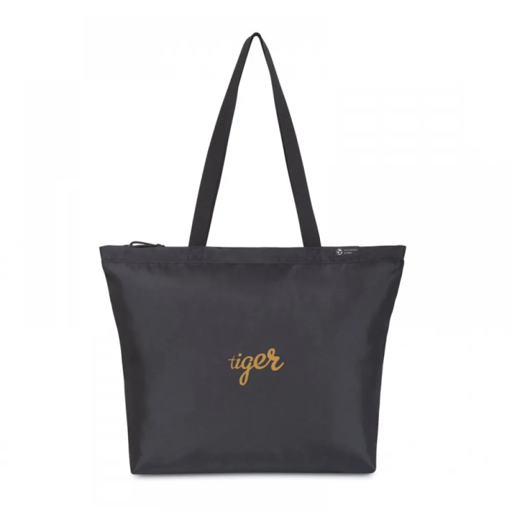 A modern and sustainable update to a classic tote bag using recycled fabric and webbing made from plastic bottles. Zippered opening to large main compartment. Interior sleeve for storing your hydration bottle. Includes AWARE™ Virtual ID &
