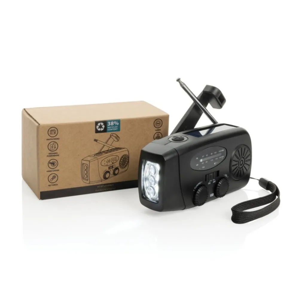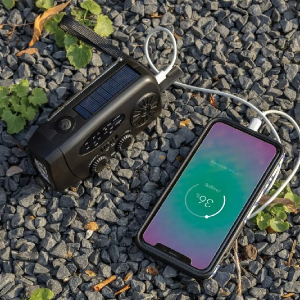Stay prepared for any situation with RescueWave, a versatile emergency radio designed to keep you connected and powered. Featuring AM/FM radio, solar panel, an integrated 1W torch, USB output and USB C input, this compact device ensures you're equipped for unexpected moments. With a built-in 1800mAh battery, RescueWave can charge your phone, providing crucial power when you need it most.