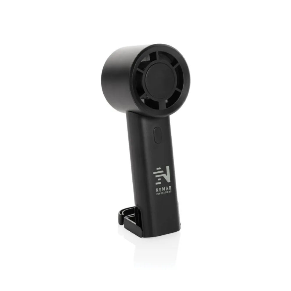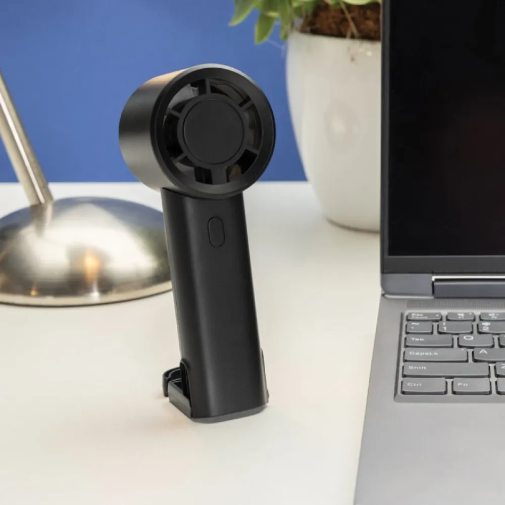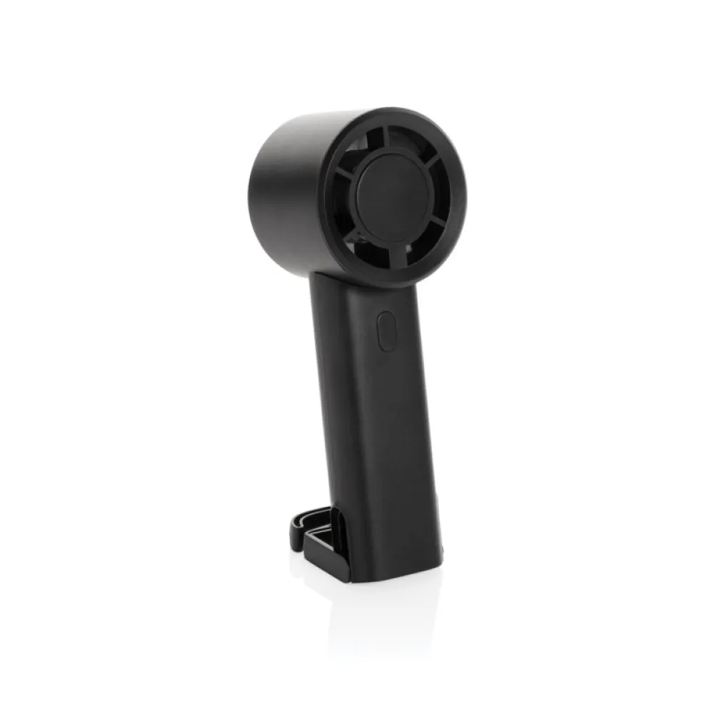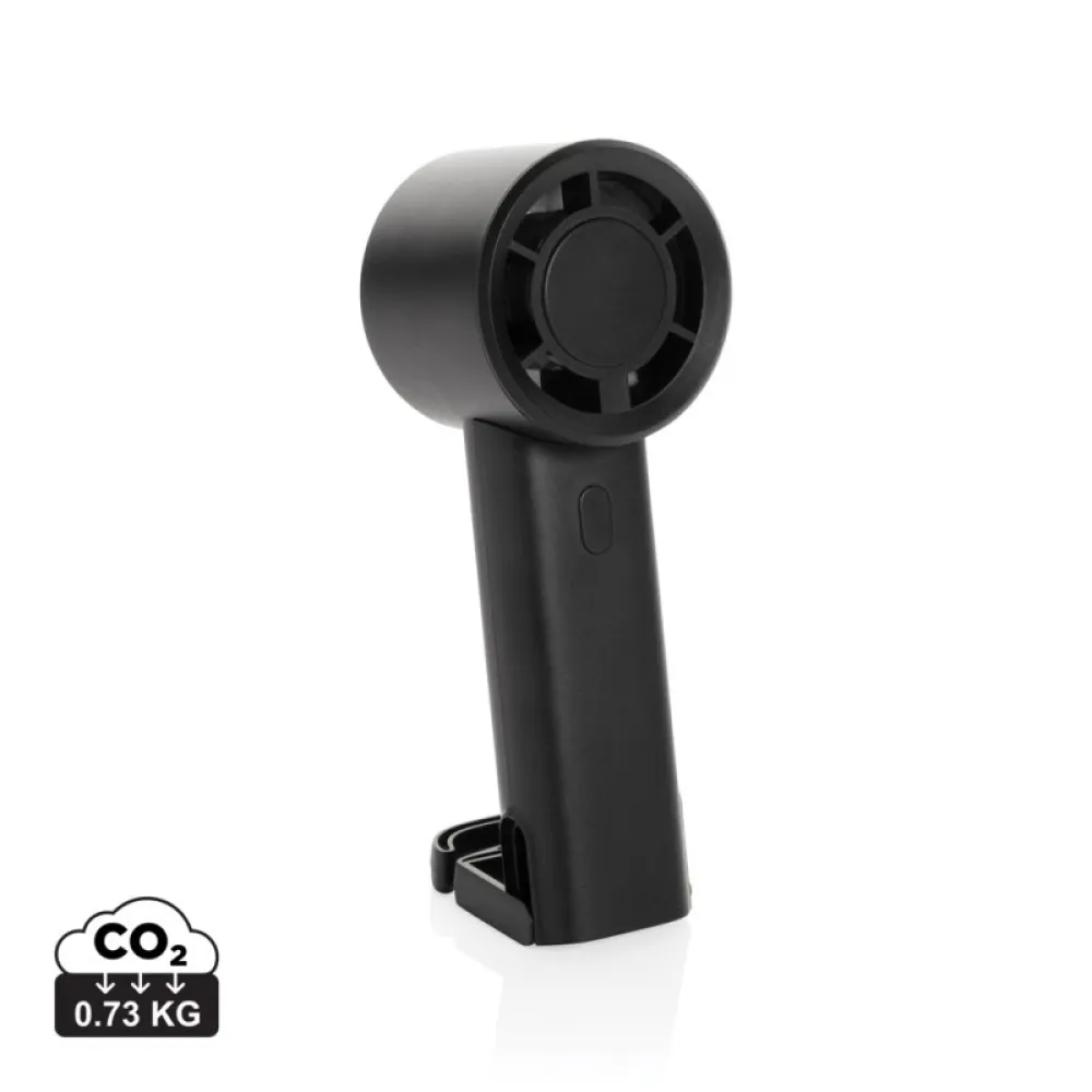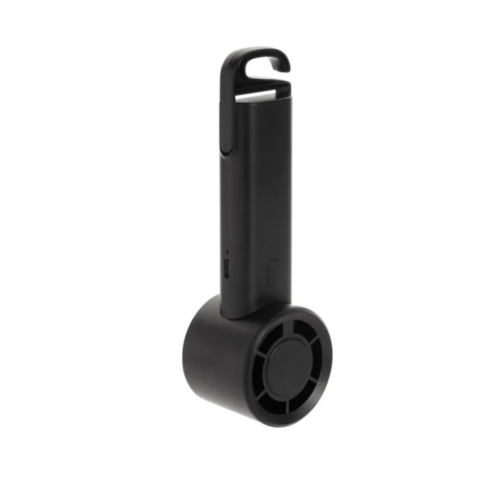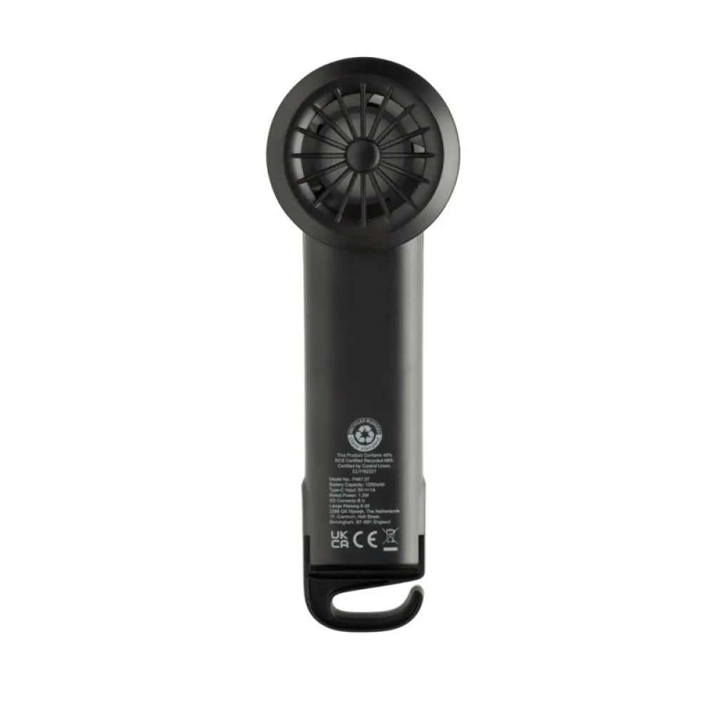 Twist portable fan, made from RCS certified recycled plastic, is a compact and versatile solution to stay cool anywhere. Its sleek black body, made from 35% RCS recycled ABS, houses a rechargeable 1200 mAh Li-ion battery, providing up to 6 hours of working time with just 3 hours of charging via the included 30 cm black