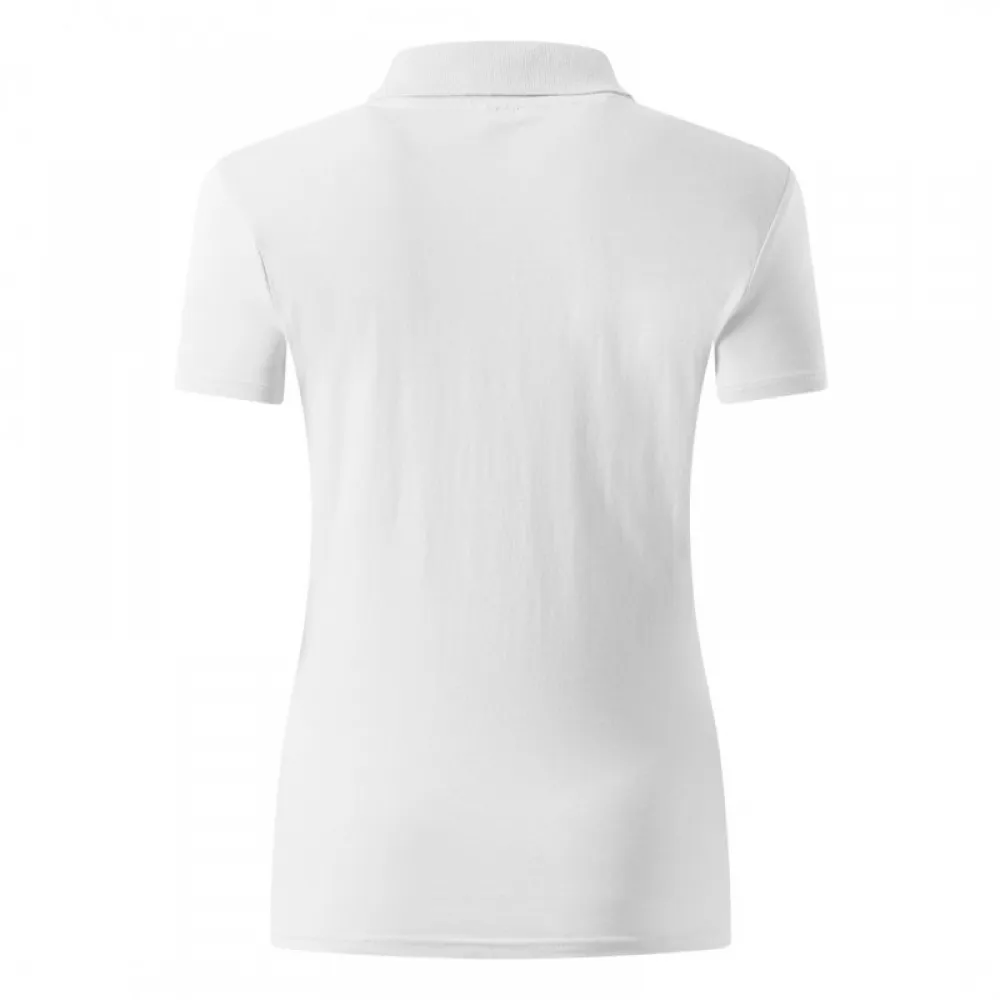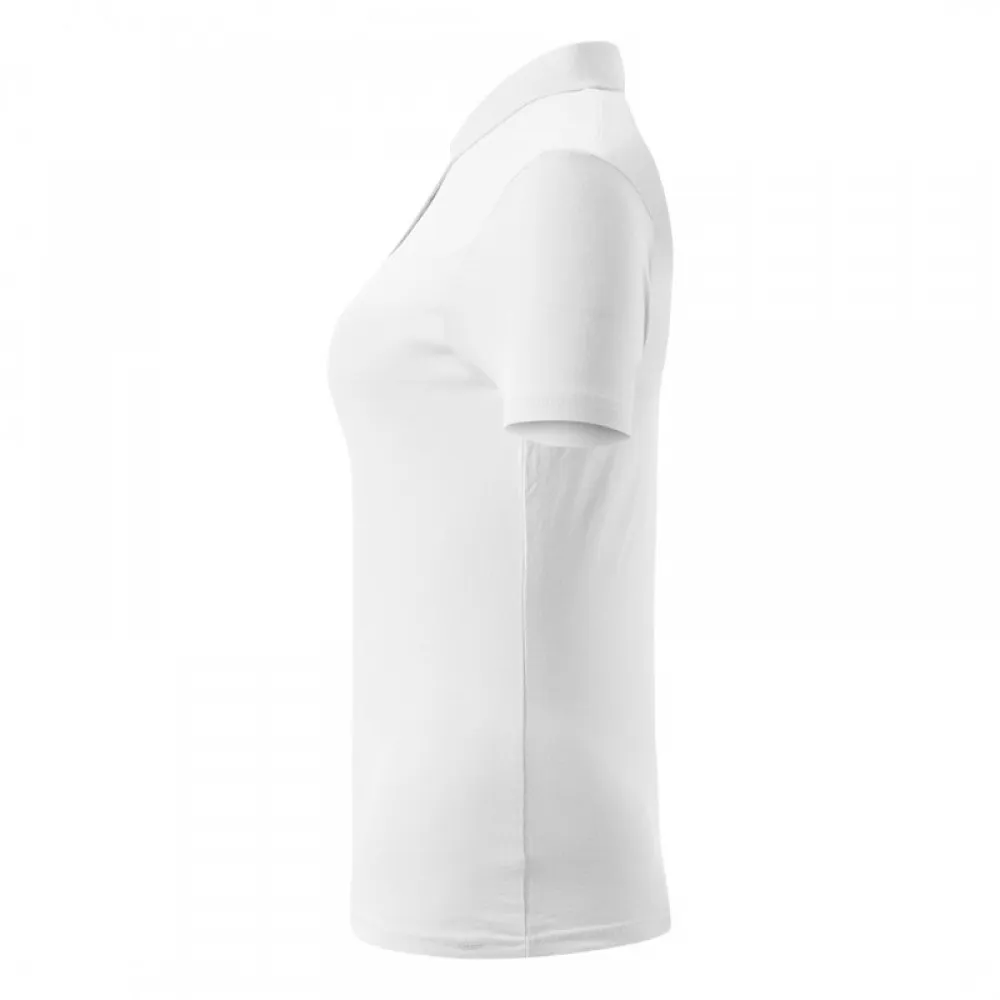 Ženska polo majica, 180 g/m2, blago strukirana, šivena sa strane, dupli štepovi na rukavima i dnu, četiri dugmeta u boji majice, rezervno dugme, ojačana trakom duž vrata i dodatnim štepom duž ramena