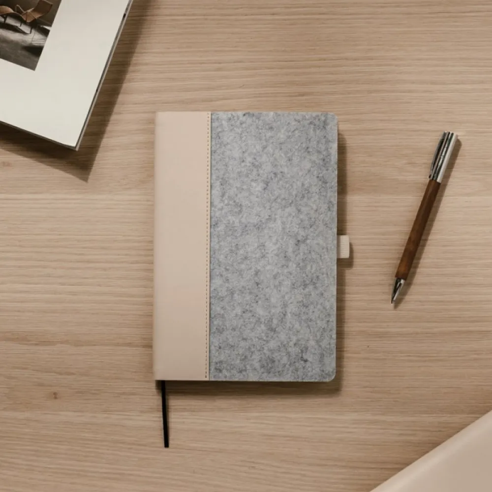 A5 notebook elegantly crafted from recycled felt, boasting a mélange effect and an integrated pen holder. Containing 80 sheets or 160 pages of 70 gsm recycled paper, its lined pages are ideal for any note-taking needs. Certified by GRS (Global Recycled Standard), GRS certification guarantees that the entire supply chain of the recycled materials is certified.