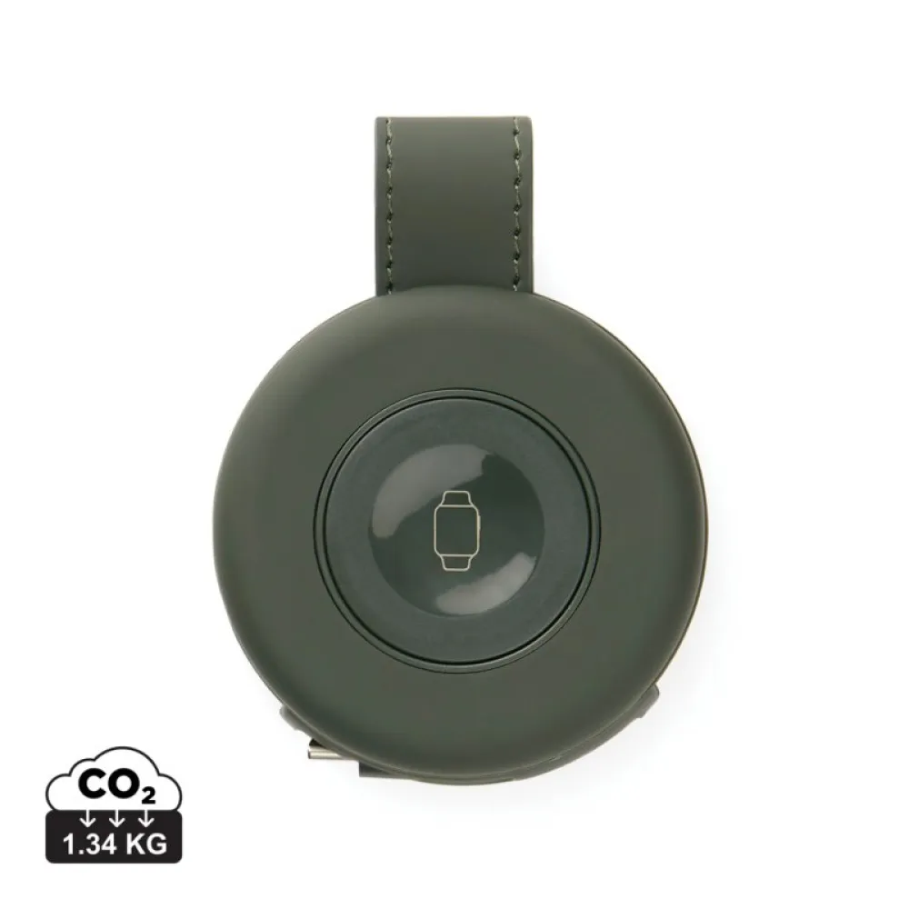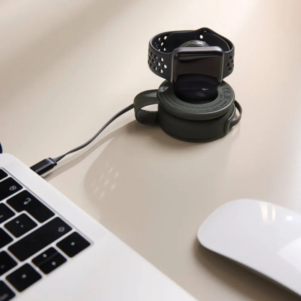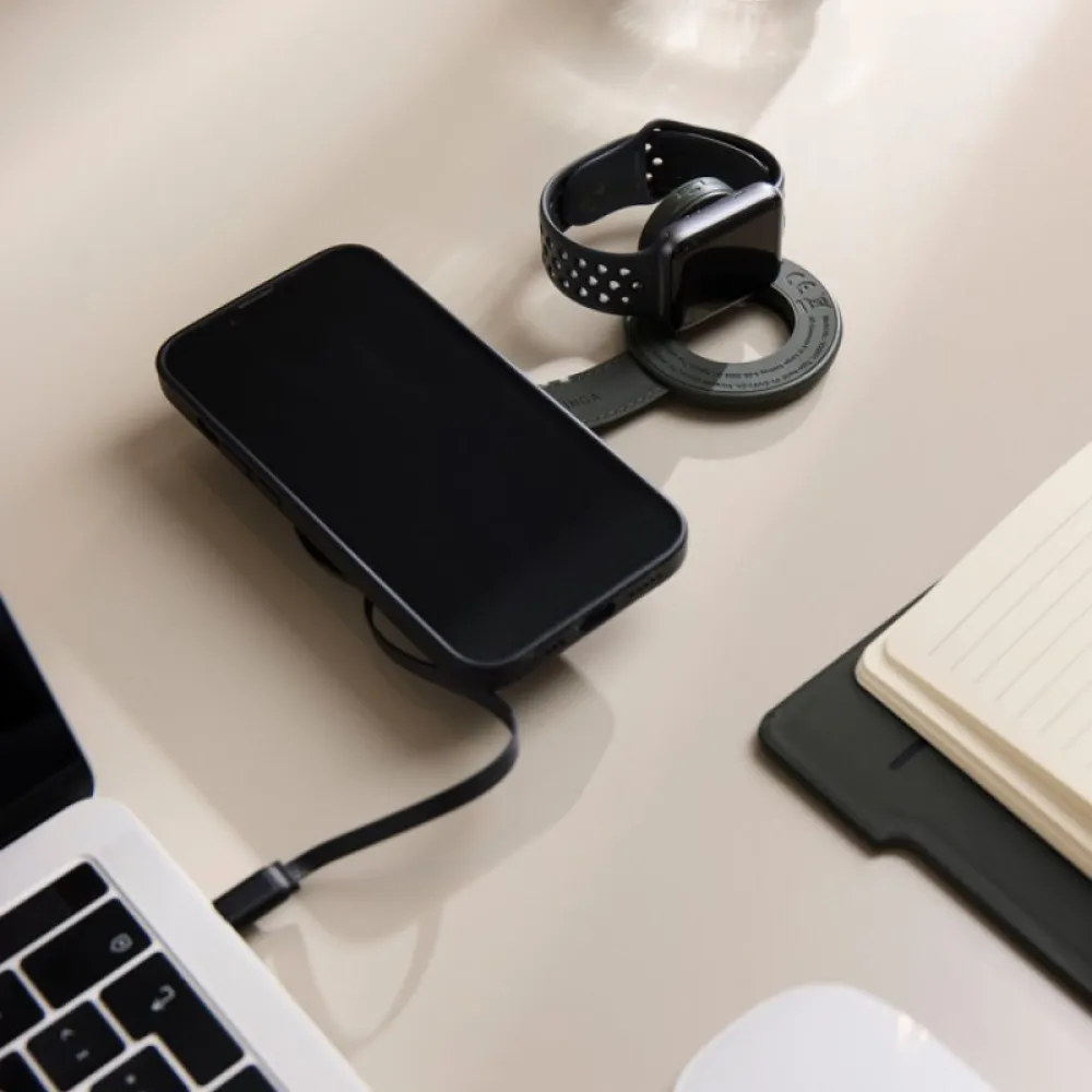 PU coating, it offers a sleek, minimalistic look. Compact and travel-ready, it wirelessly charges both your phone and your watch at the same time, making it the perfect companion for life on the move. With Qi compatibility, precise magnetic alignment and fast wireless charging, your devices stay perfectly positioned and power up quickly. Simply connect it to a USB-C power source for a seamless, organised charging setup. Compatible with Qi-enabled devices, including phones and Apple and Samsung watches.