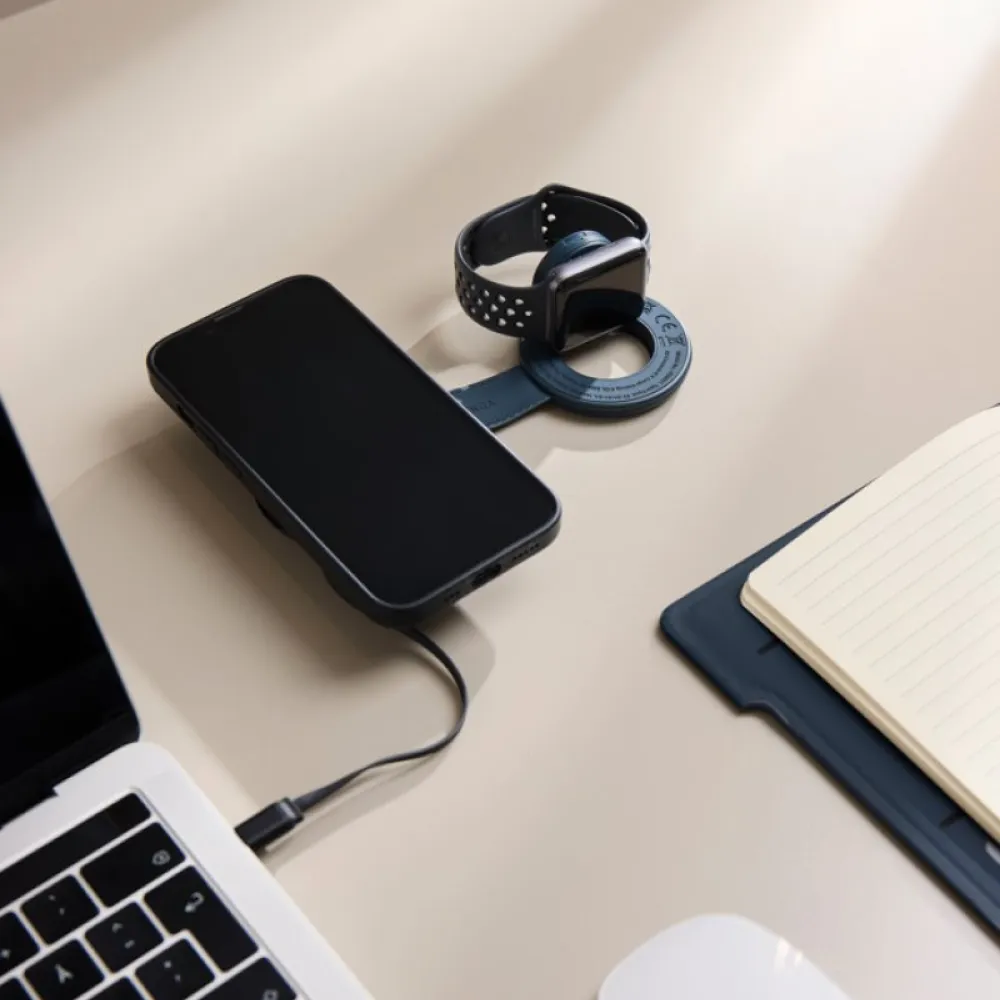 PU coating, it offers a sleek, minimalistic look. Compact and travel-ready, it wirelessly charges both your phone and your watch at the same time, making it the perfect companion for life on the move. With Qi compatibility, precise magnetic alignment and fast wireless charging, your devices stay perfectly positioned and power up quickly. Simply connect it to a USB-C power source for a seamless, organised charging setup. Compatible with Qi-enabled devices, including phones and Apple and Samsung watches.