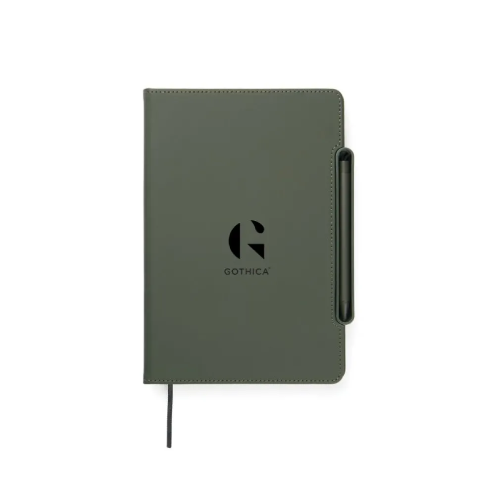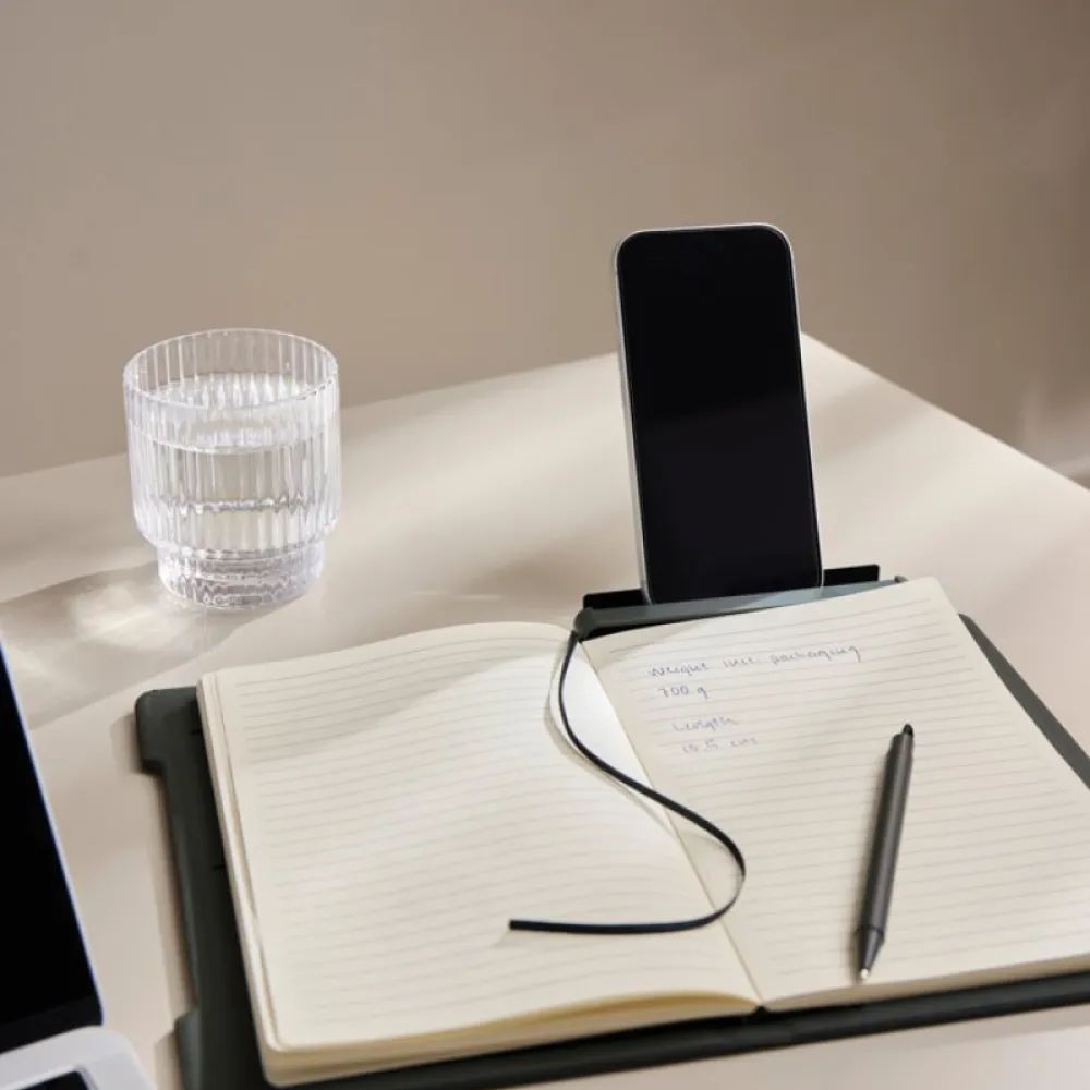 The pen holder easy transforms into a phone stand integrated into the notebook’s structure.