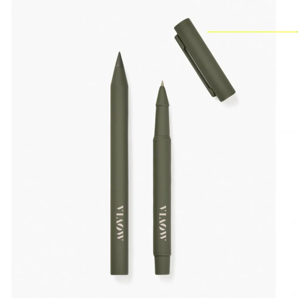This modern and sleek set includes two pens: an eternal pen and a classic ballpoint pen with a cap and clip.