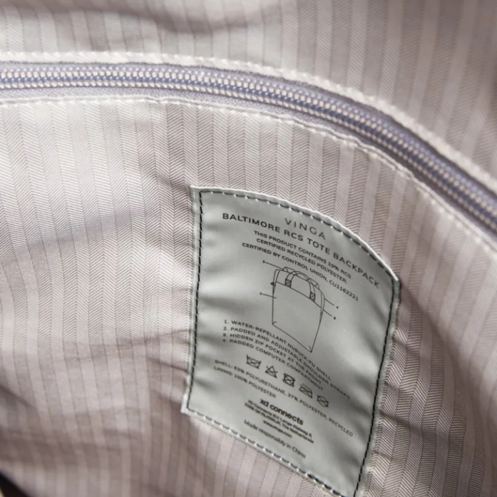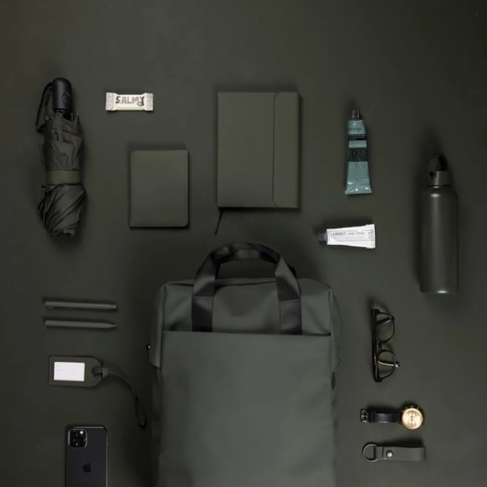 The bag features a wide zippered opening for convenient packing of your laptop and other valuables. A strap on the back allows it to be attached to a trolley for smooth travel. It also includes a large front pocket, an inner pocket, and a practical bottle holder. Certified by RCS (Recycled Claim Standard), RCS certification guarantees that the entire supply chain of recycled materials is certified.