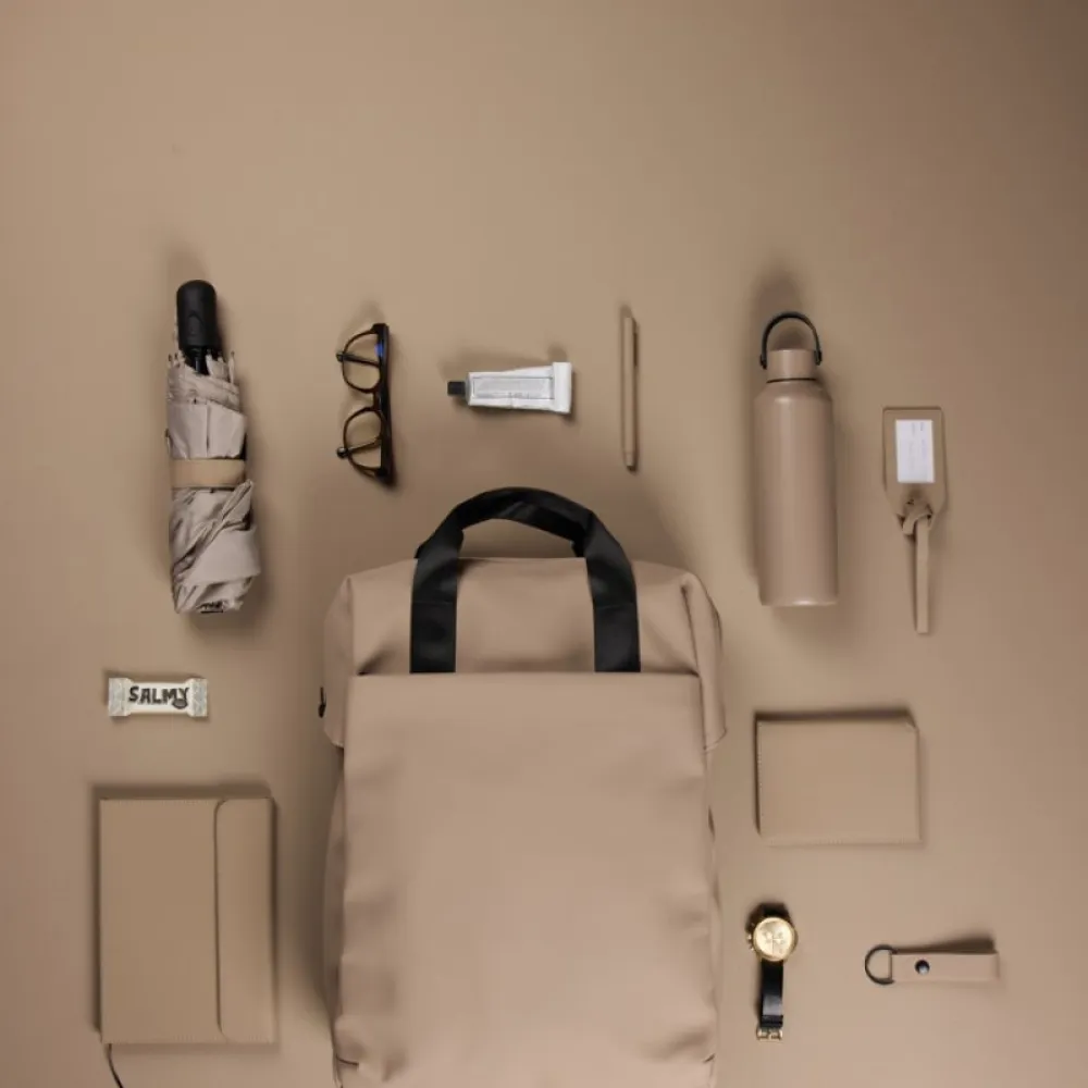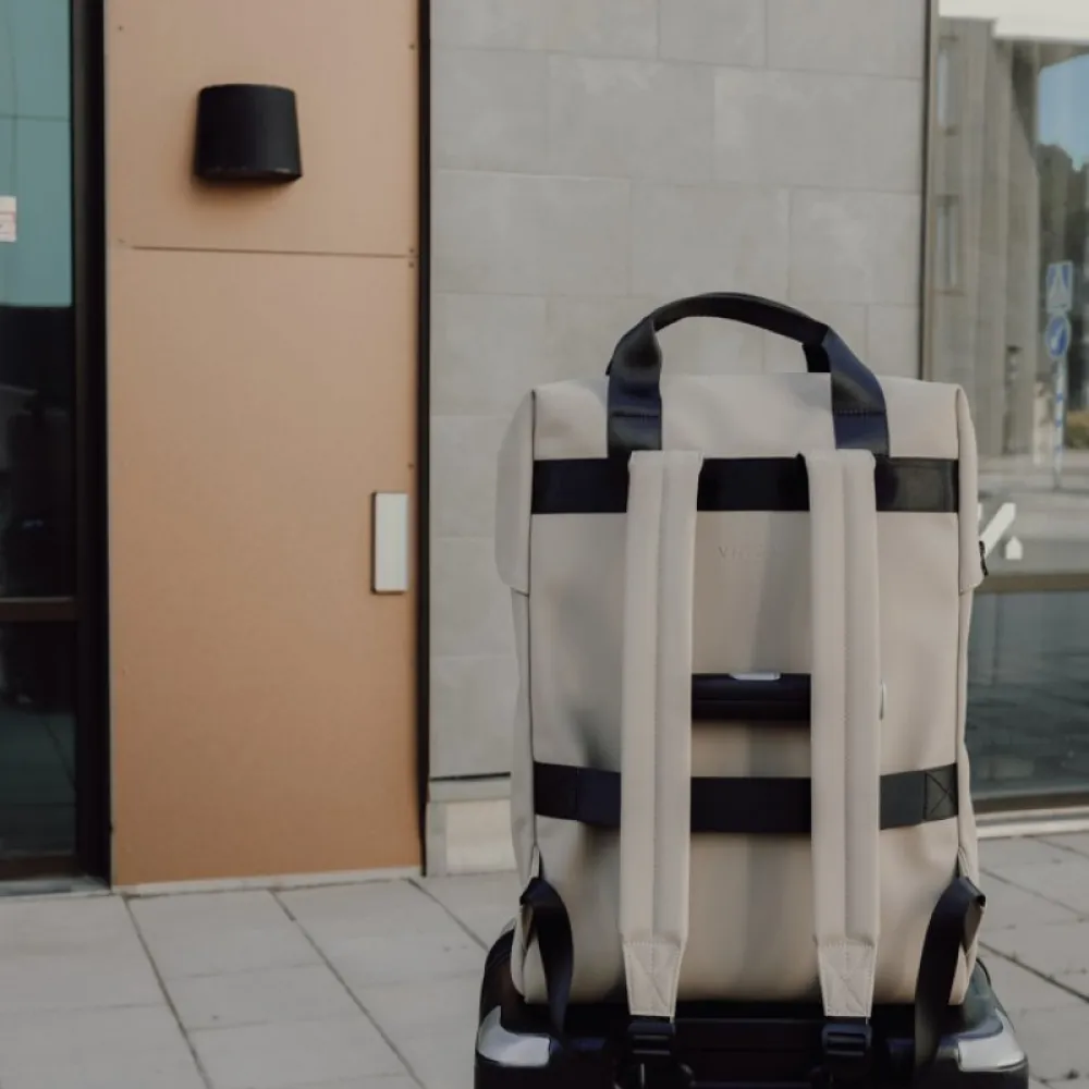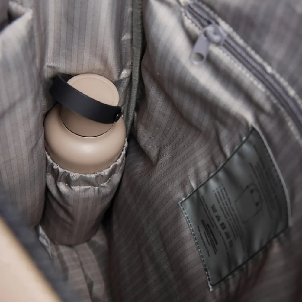 The bag features a wide zippered opening for convenient packing of your laptop and other valuables. A strap on the back allows it to be attached to a trolley for smooth travel. It also includes a large front pocket, an inner pocket, and a practical bottle holder. Certified by RCS (Recycled Claim Standard), RCS certification guarantees that the entire supply chain of recycled materials is certified.